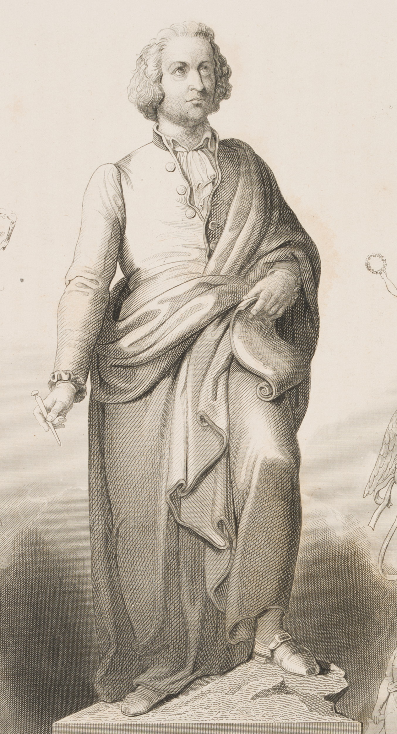 Albert Henry Payne (1812 London – 1902 Leipzig), Ganzfiguriges heroisches Portrait nach dem Mozartdenkmal in Salzburg, umgeben von allegorischen Szenen, 1842, Stahlstich