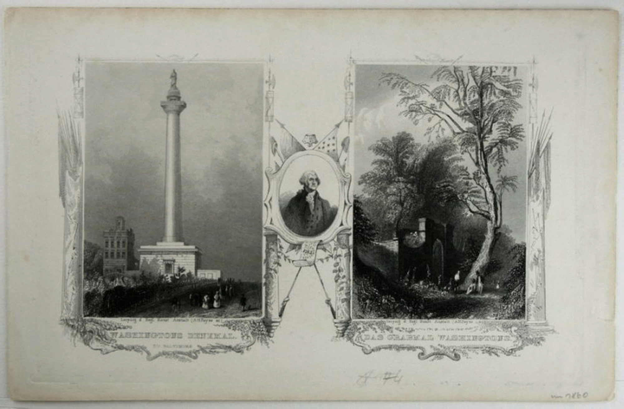 - Description: Steel engraving by A. H. Payne, inscribed: ” Leipzig d. Engl. Kunst. Anstalt (A. H. Payne sc.) Washingtons Denkmal zu Baltimore Das Gramal Washingtons”. Two very nice views of the monuments, with a portrait of George Washington in the center. Albert Heinrich Payne (London 1812 – Leipzig 1902) was a steel and copper engraver, etcher, painter and illustrator. From 1838 Payne was a publisher in Leipzig and Dresden. Around 1850 he published the “Dresdner Gemäldegalerie. Old Masters” with 126 steel engravings.