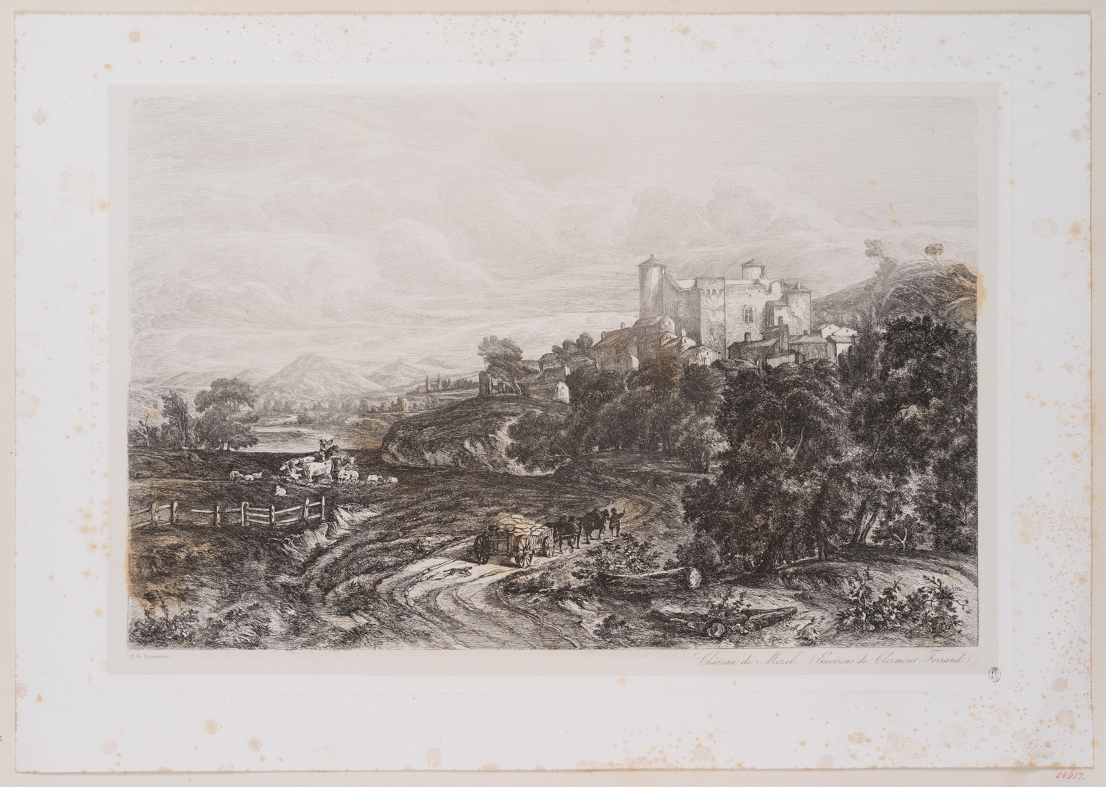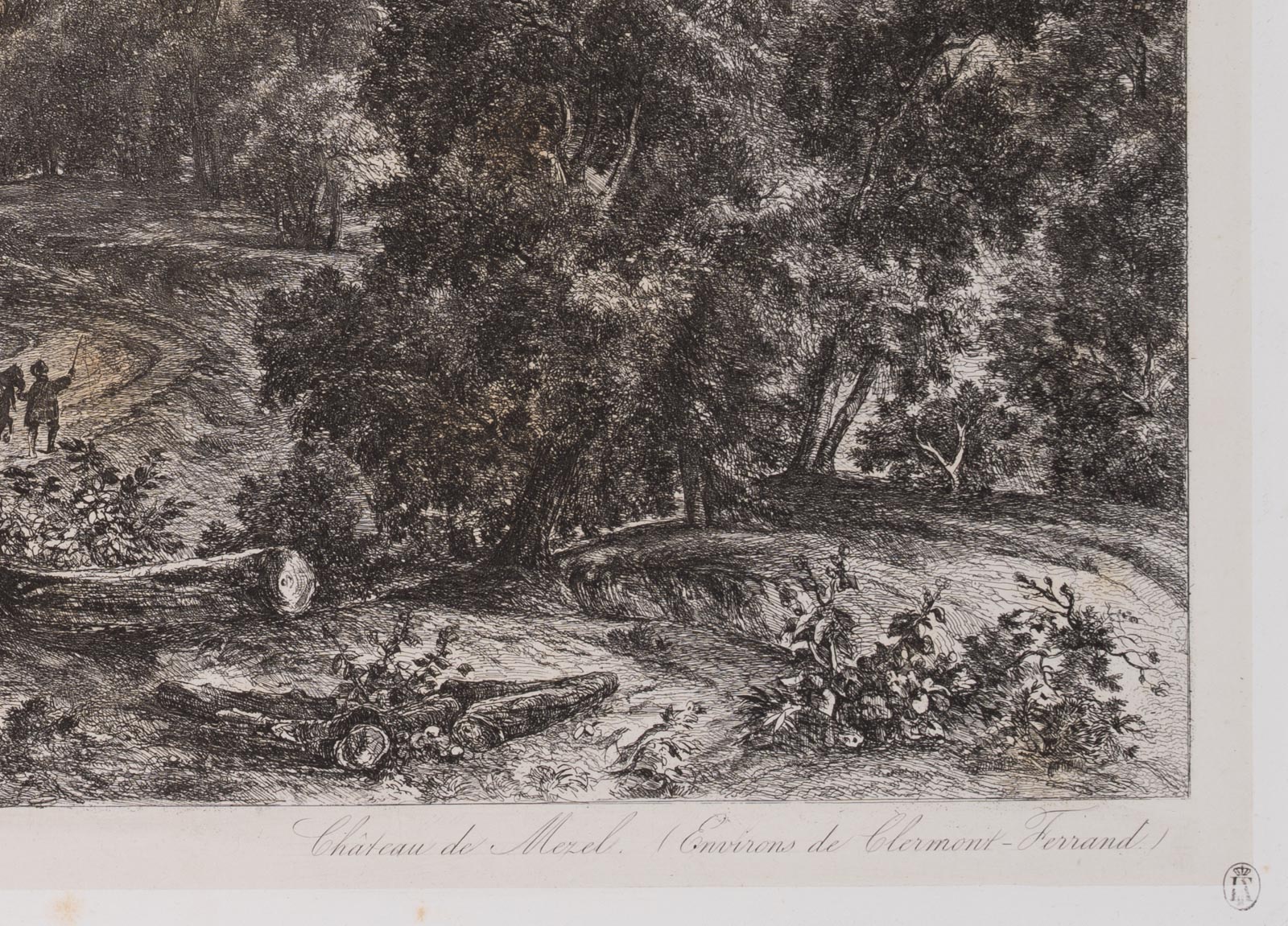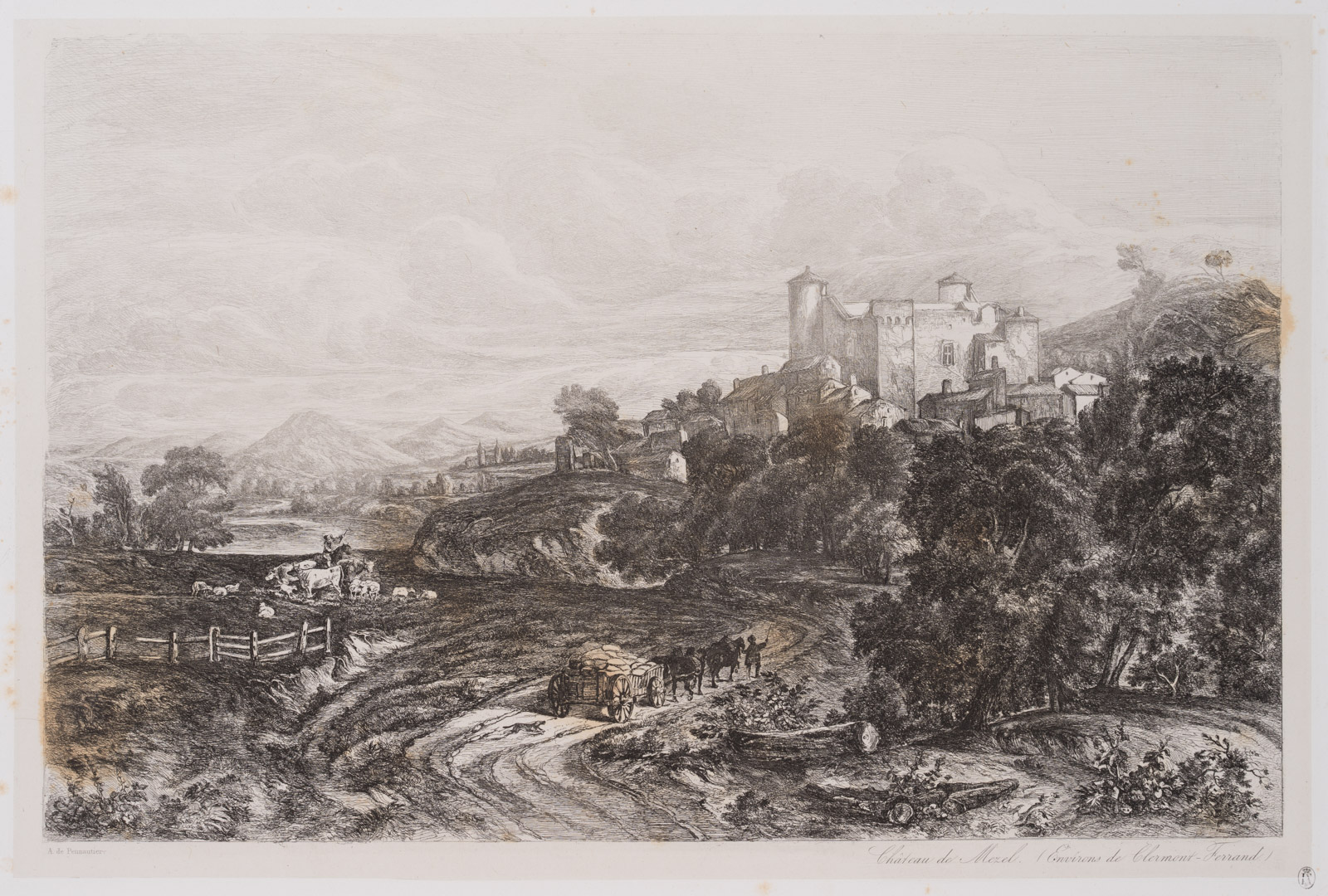 Amédée de Pennautier (1803 Domaize – 1857 Paris), View over landscape with Chateau de Mezel, 19th century, Etching