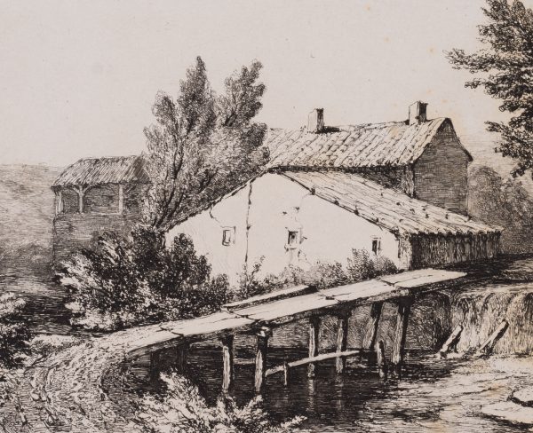 Amédée de Pennautier (1803 Domaize – 1857 Paris), Farm by the river at Pointis, Haute de Garonne, 19th century, Etching
