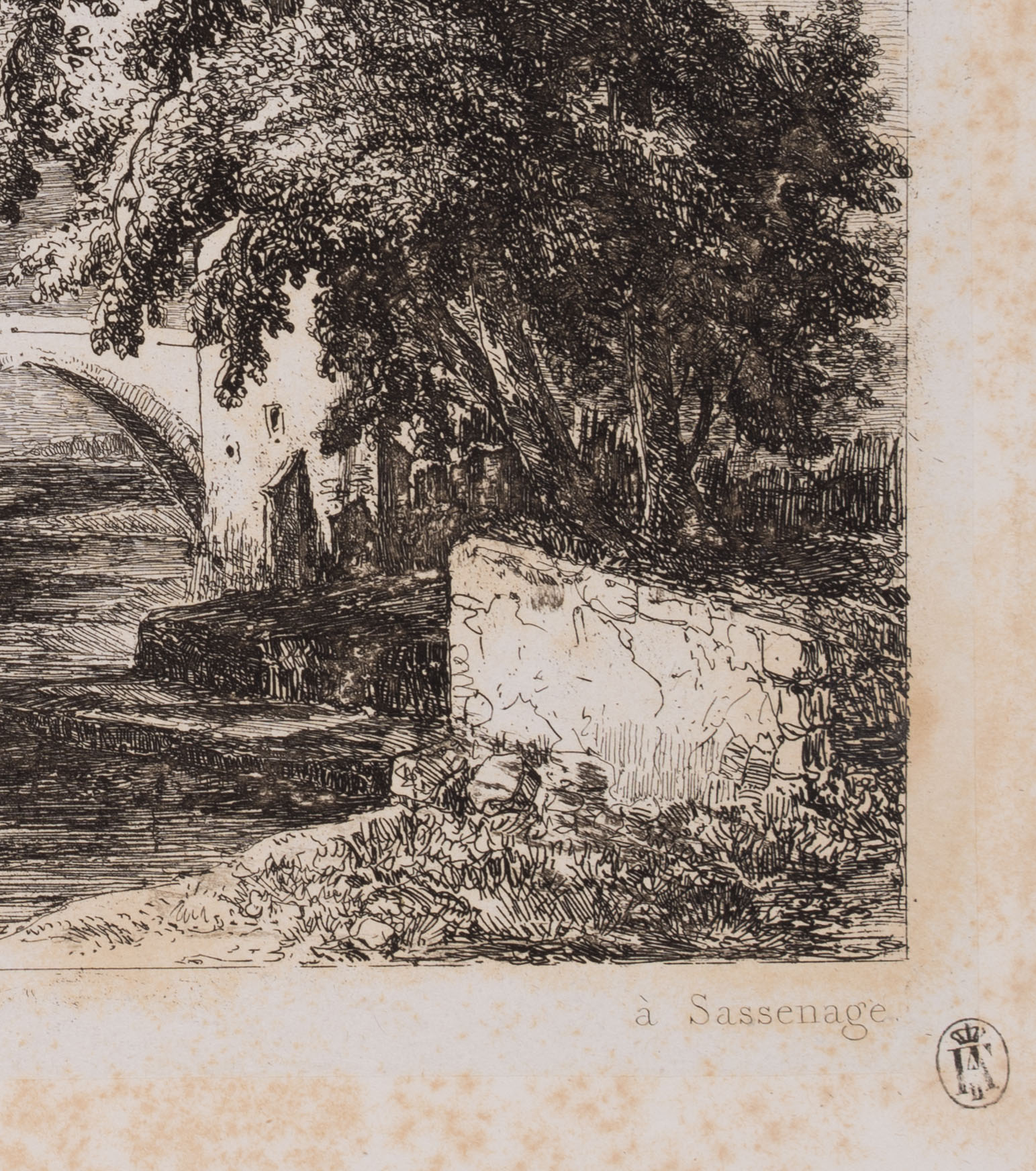 Amédée de Pennautier (1803 Domaize – 1857 Paris), Hof am Fluss bei Sassenage, Grenoble, 19. Jahrhundert, Radierung