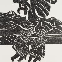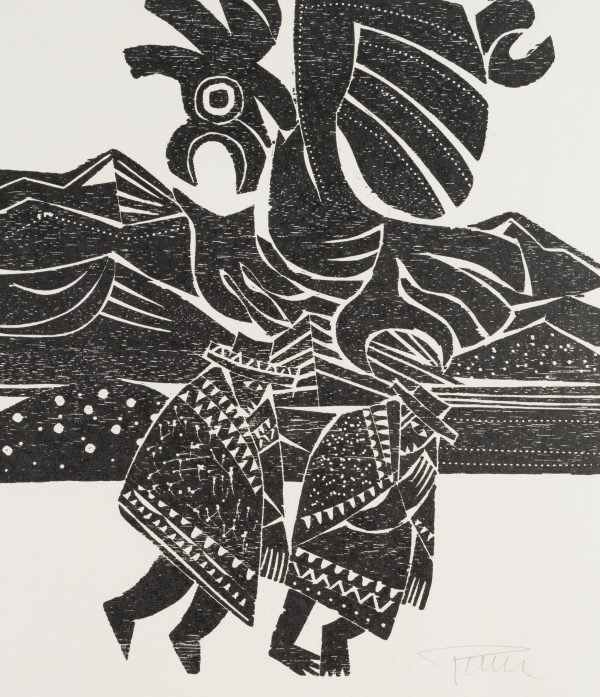 - Description: Illustration as a design for the poster of the exhibition ‘Alfred Pohl. Colour woodcuts from South America. The woodcut in black shows two people in poncho with sombrero in front of a mountain range in front of which a large bird flies with its beak wide open.
