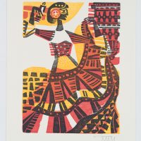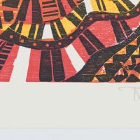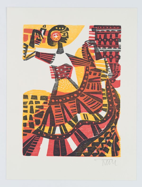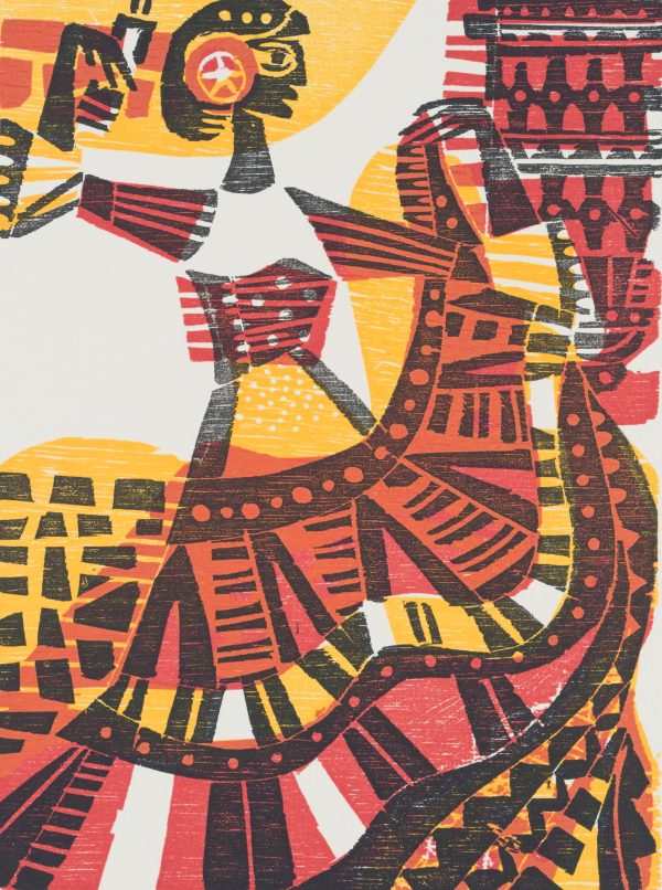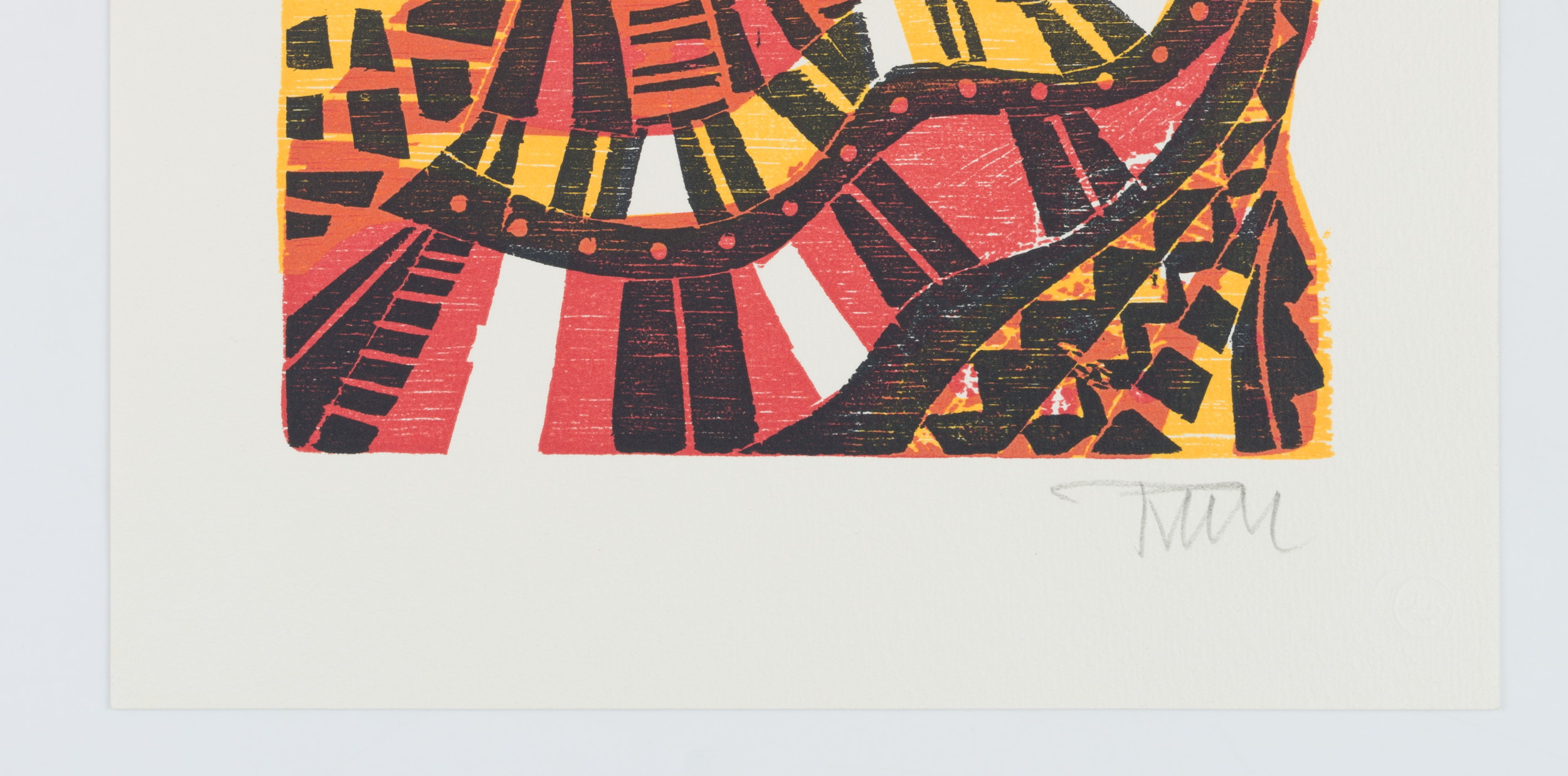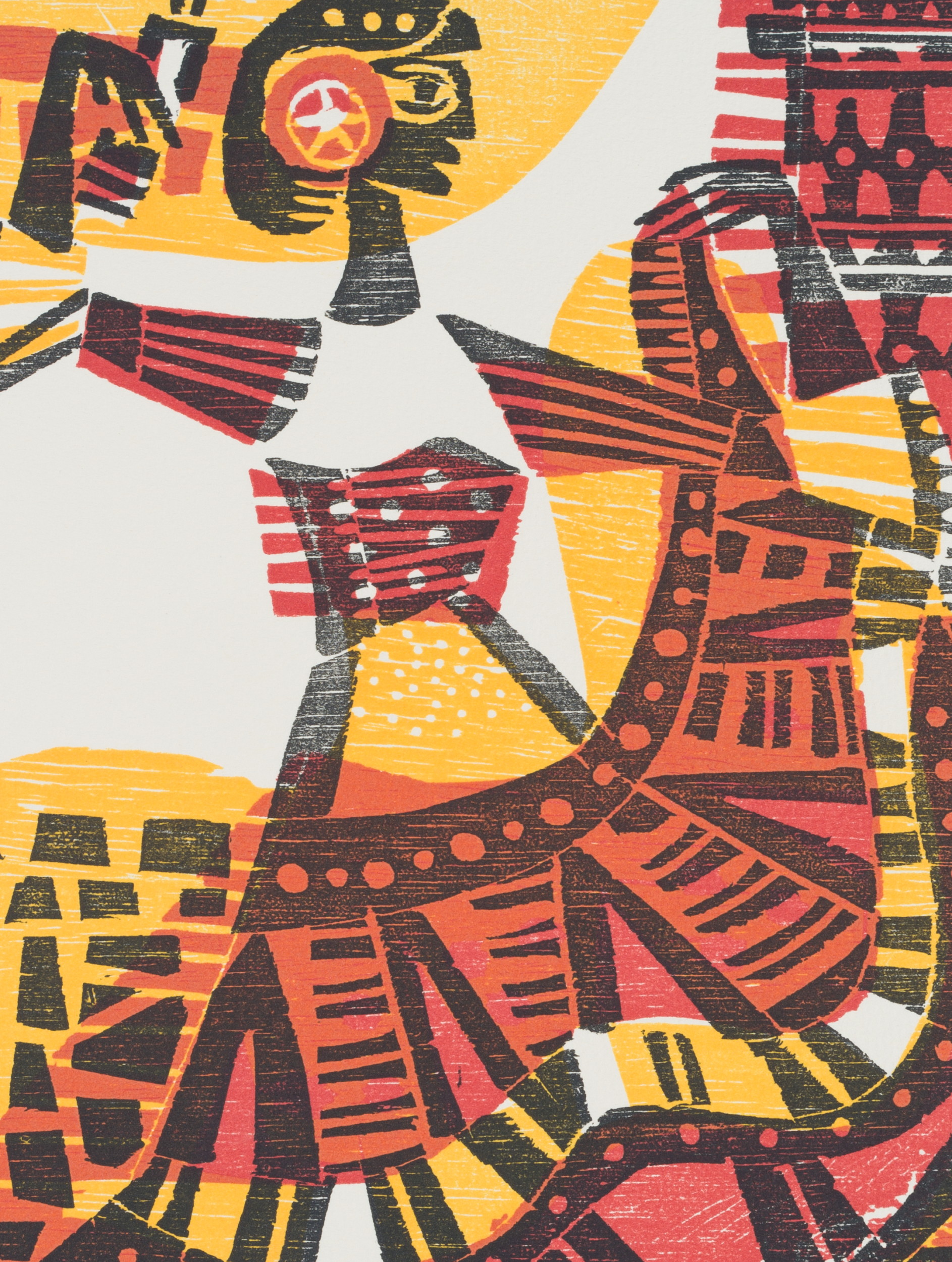 - Beschreibung: Farbholzschnitt aus drei Farbstöcken in warmen Erdfarben: gelb, rot und orange. Die Muster aus kräftigen Farben lassen an das Licht, das Gestein und die Erde Lateinamerikas denken.