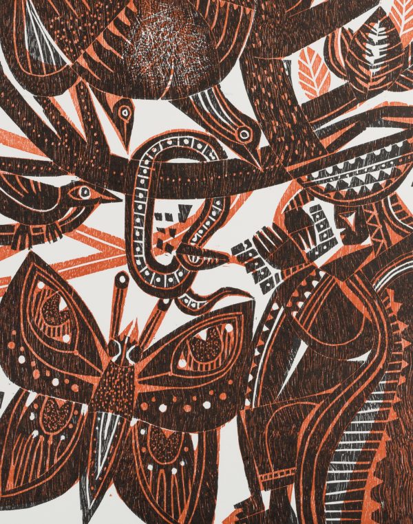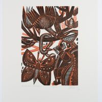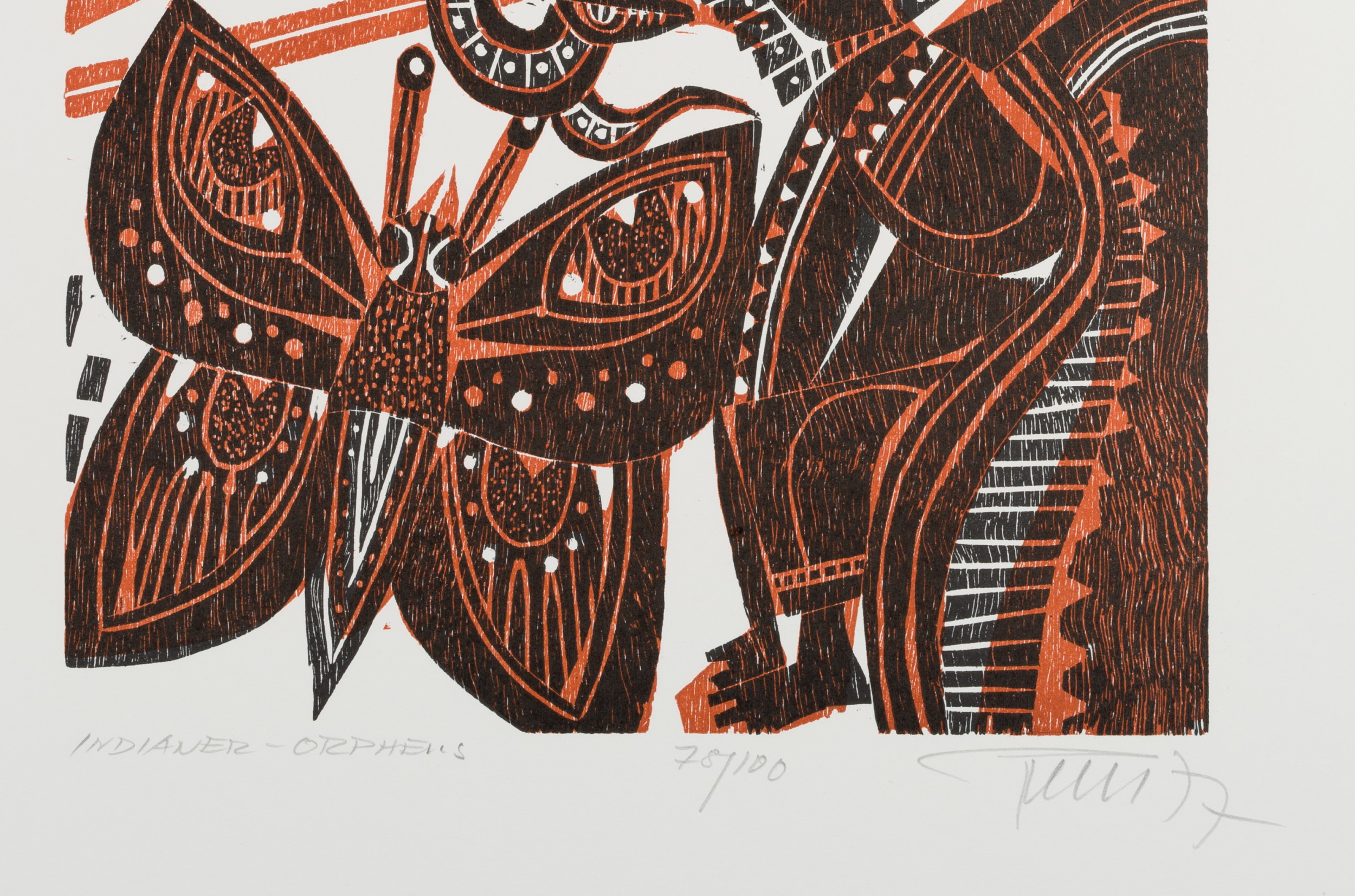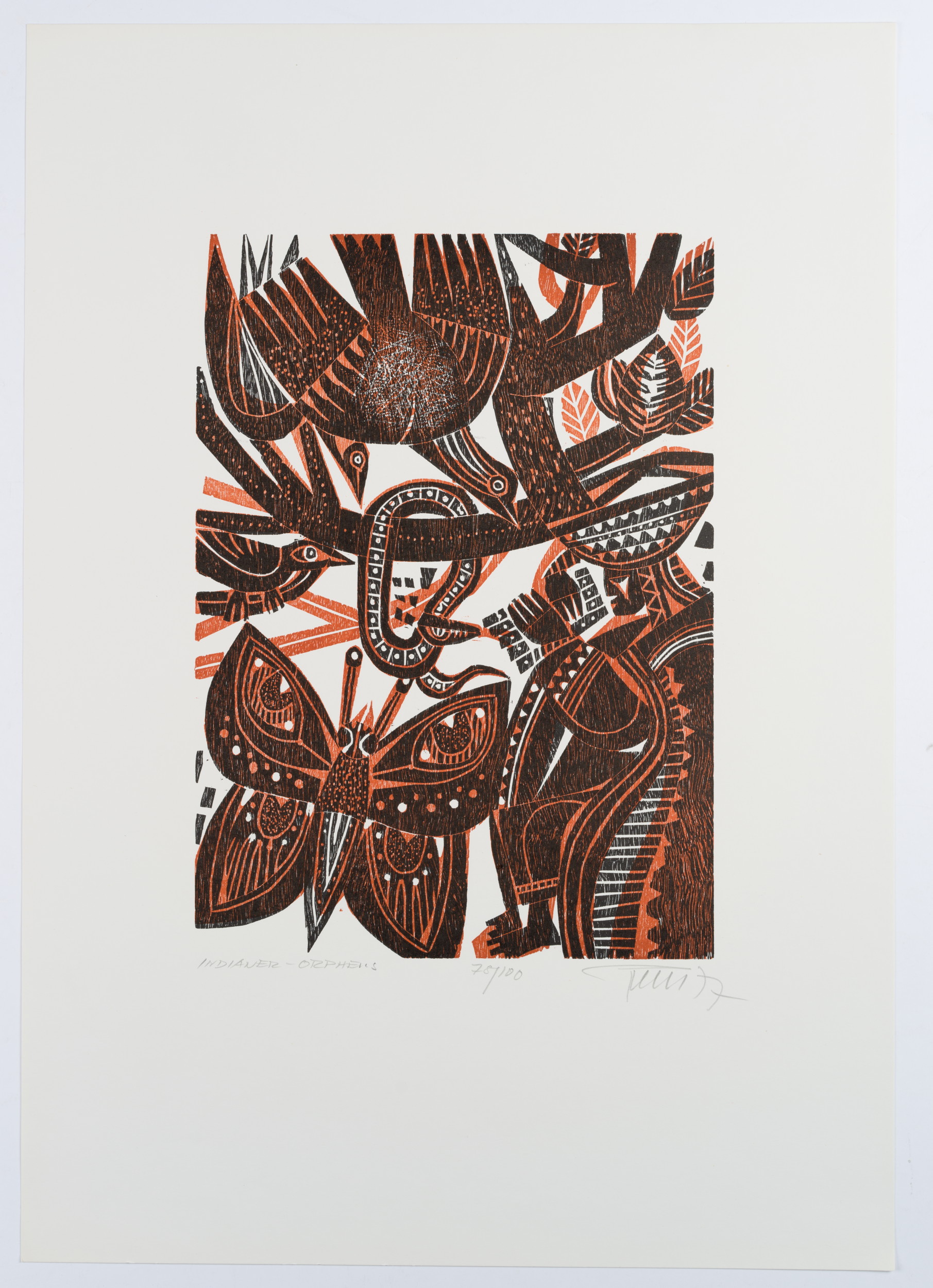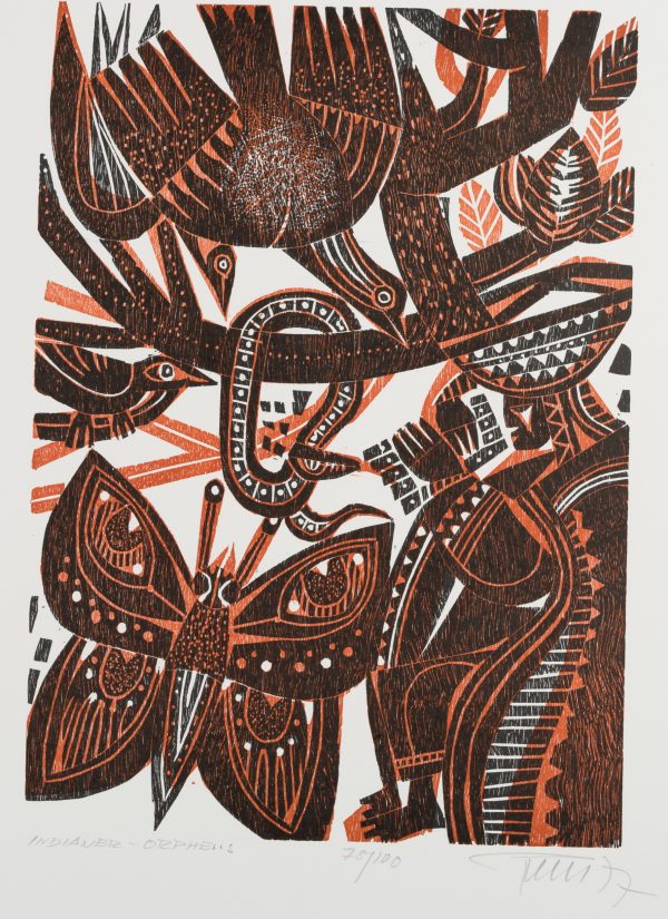Alfred Pohl (*1928 Essen), ‘Indianer-Orpheus’. Panflötenspieler mit Vögeln, Schlange und Schmetterling, 1977, Farbholzschnitt