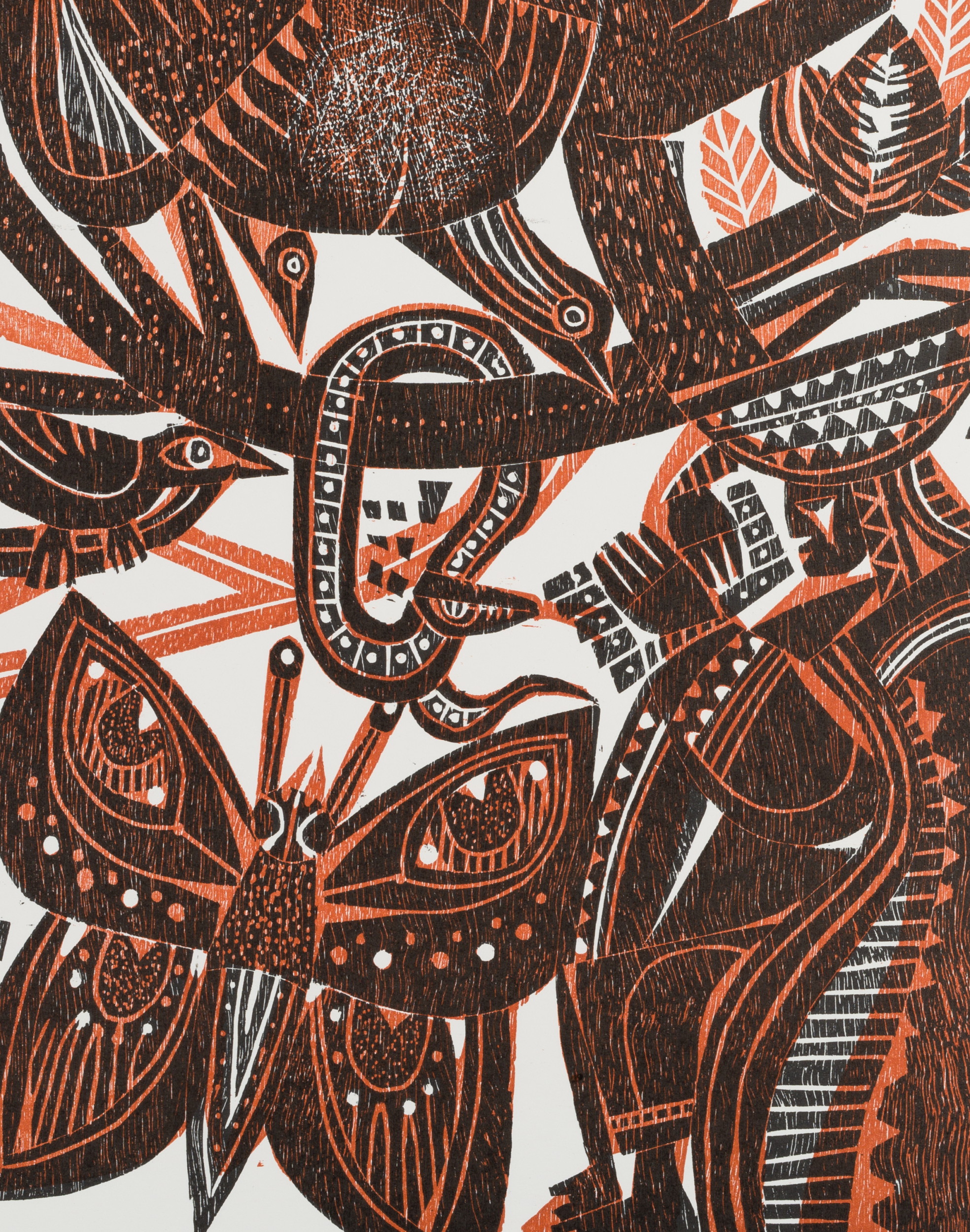 Alfred Pohl (born 1928 Food), ‘Indian Orpheus’ Panpipe player with birds, snake and butterfly, 1977, Color woodcut