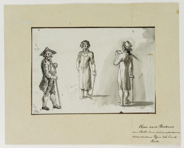 - Beschreibung: Haltungsstudie dreier Männer mit Stock von vorne, der Seite und von hinten gesehen. Die Figuren sind in historischer Mode des Rokoko dargestellt.