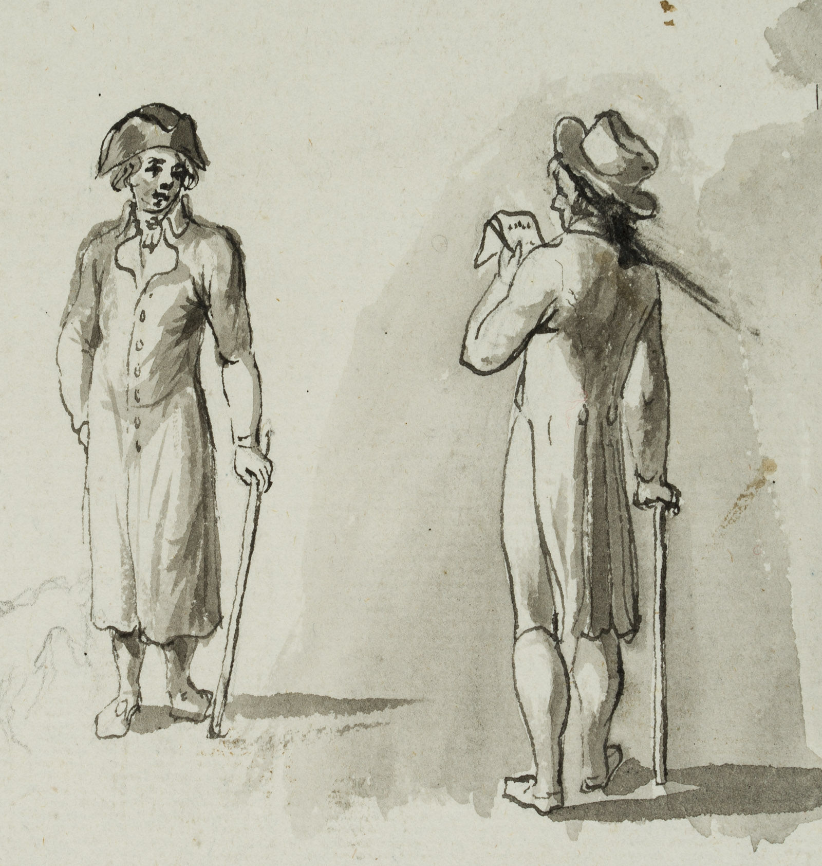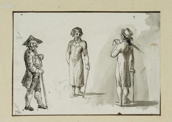 - Description: Posture study of three men with canes seen from the front, the side and the back. The figures are depicted in historical rococo fashion.