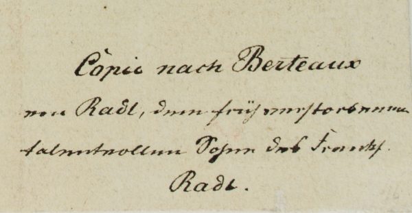 - Bezeichnung: Unten rechts weitere Beschriftungen: “Copie nach Berteaux von Radl, dem früh verstorbenen talentvollen Sohn des Frankfurter Radl”.