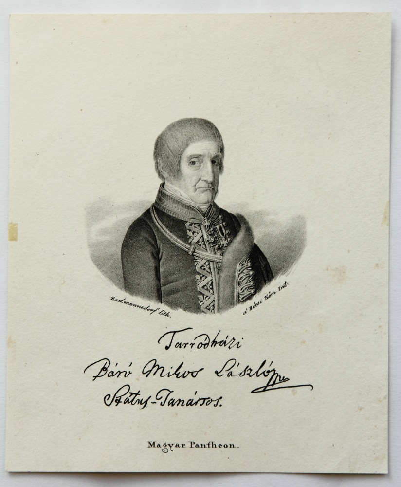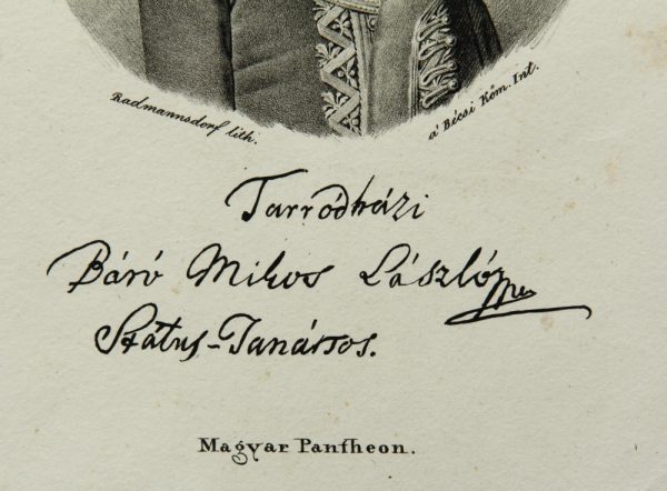 - Beschreibung: Albert Riemensberg von RADMANNSDORF (1802 Wien – 1860 ebd. ), Porträt eines ungarischen Offiziers und Staatsmannes, Baron “Báró Mikos Lászlóppe Státny-Tanársos[?]”, Lithographie. Beschreibung:Lithographie auf Papier. Unterhalb der Darstellung in Stein signiert und im Druck mit mutmaßlicher Unterschrift des Dargestellten versehen. Teil der ungarischen ZeitschriftenreiheMagyar Pantheon.