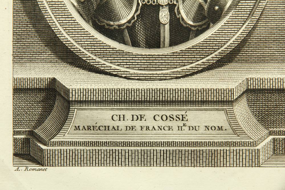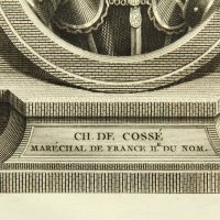 - Inscription: Below the fictitious oval frame is the sitter’s name with the French title “Maréchal de France IIe. du Nom”. Below this the sheet is signed by the artist in the printing plate. The depiction is from an extensive series of famous persons by the Italian artist Vincenzo Vangelisti (c. 1738 Florence – 1798 Paris).