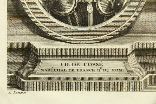 - Bezeichnung: Unterhalb des fingierten ovalen Rahmens befindet sich der Name des Dargestellten mit dem französischsprachigen Titel “Maréchal de France IIe. du Nom”. Darunter ist das Blatt in der Druckplatte vom Künstler signiert. Die Darstellung stammt aus einer umfangreichen Serie berühmter Personen von dem italienischen Künstler Vincenzo Vangelisti (um 1738 Florenz – 1798 Paris).