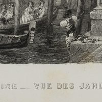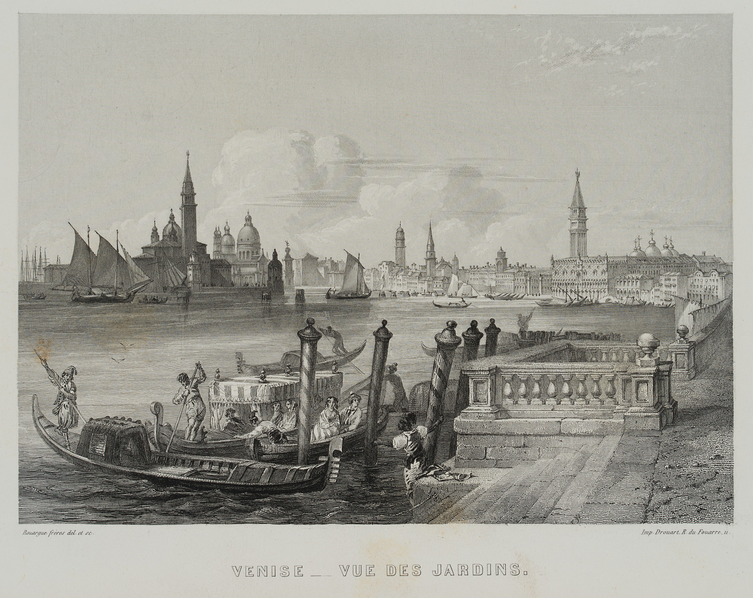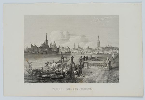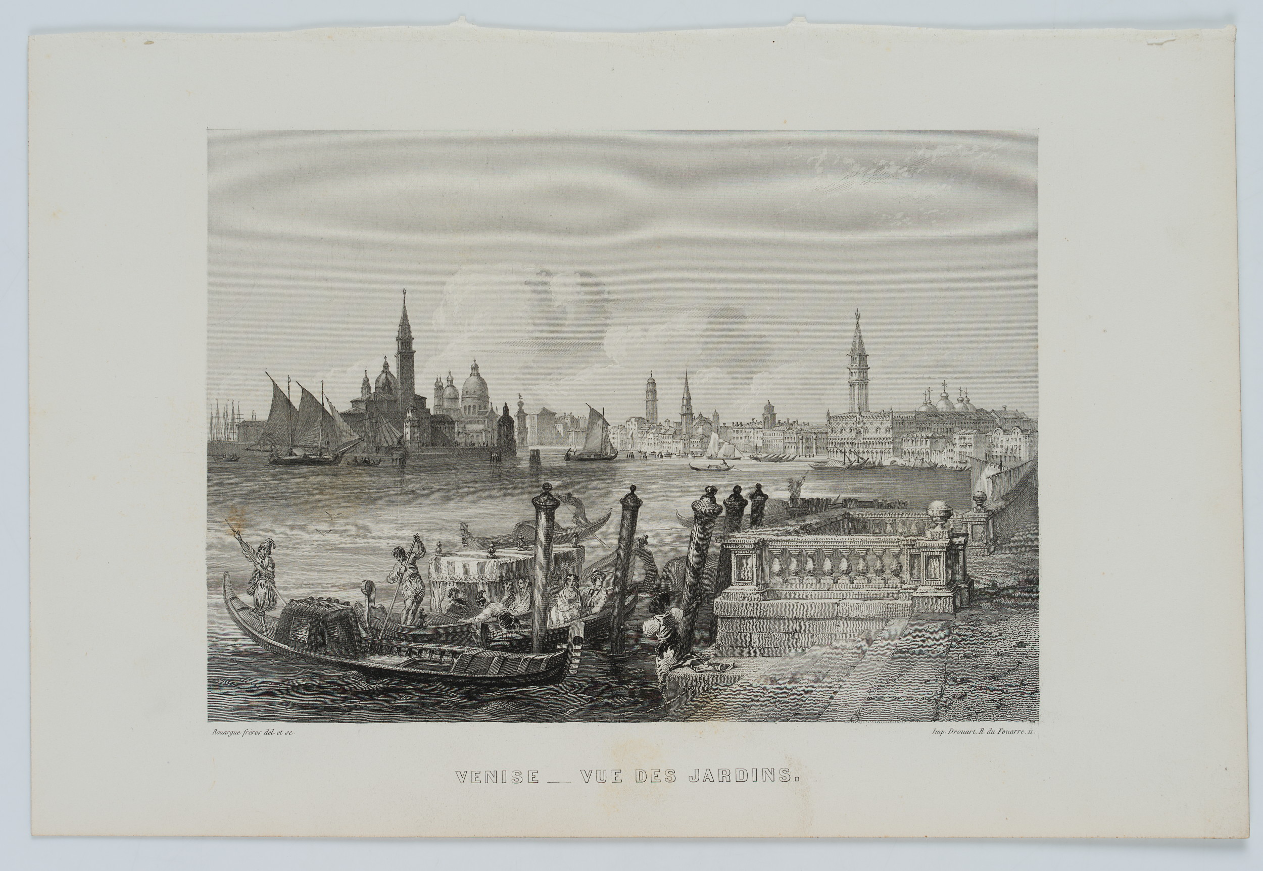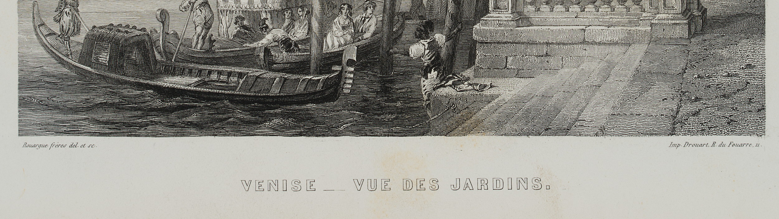 - Inscription: At the lower part signed in the printing plate: “Rouargue fréres del. et sc. | Imp. Drouart R. du Fouarre II”. At the lower part inscribed in the printing plate: “Venise_Vue des Jardins”.