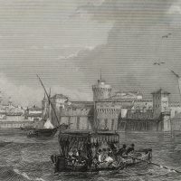- Description: View from the sea towards the harbour fortress of Livorno. In the foreground, figures in costumes typical of the time and place on ships.