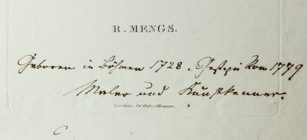 - Beschreibung: Albert SCHULE (1801 Leipzig – 1875 ebd. ), Porträt des Anton Raphael Mengs (1728 Aussig – 1779 Rom), Maler, 1821, Kupferstich. Beschreibung:Kupferstich auf Papier. Unterhalb des Porträts in Druckplatte signiert und auf 1821 datiert. Darunter mit Namen des Dargestellten versehen. Zusätzlich in Tusche mit Lebensdaten des Porträtierten beschriftet.