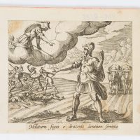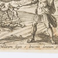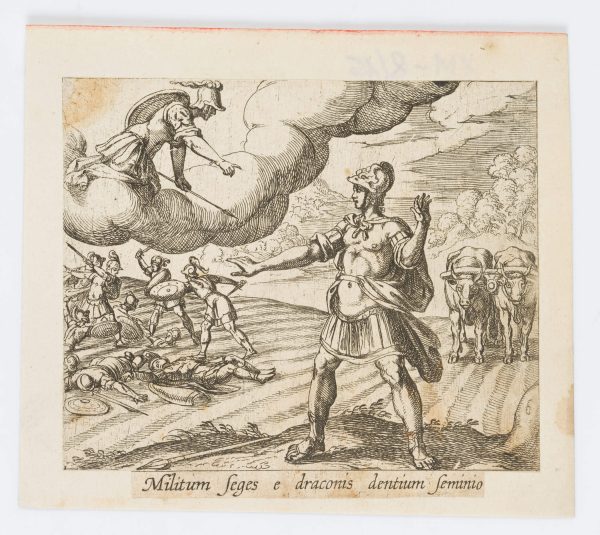 - Inscription: Lower middle inscribed in the printing plate: “Militium Seges e draconis dentium seminio”.