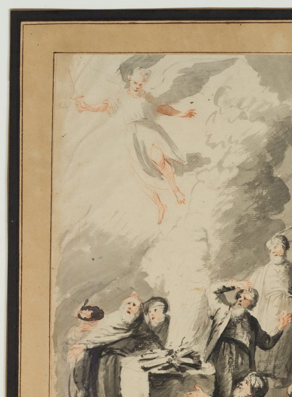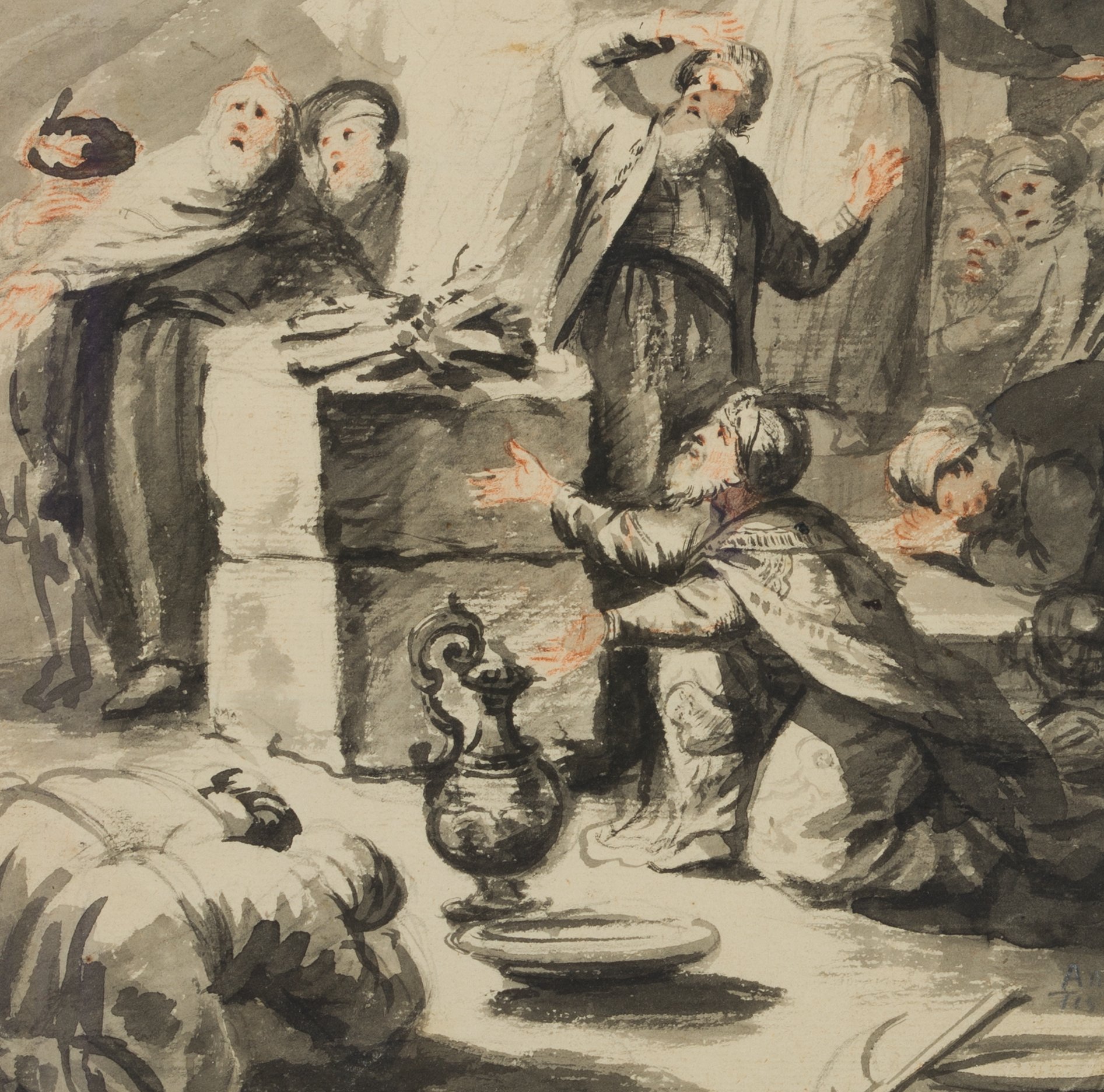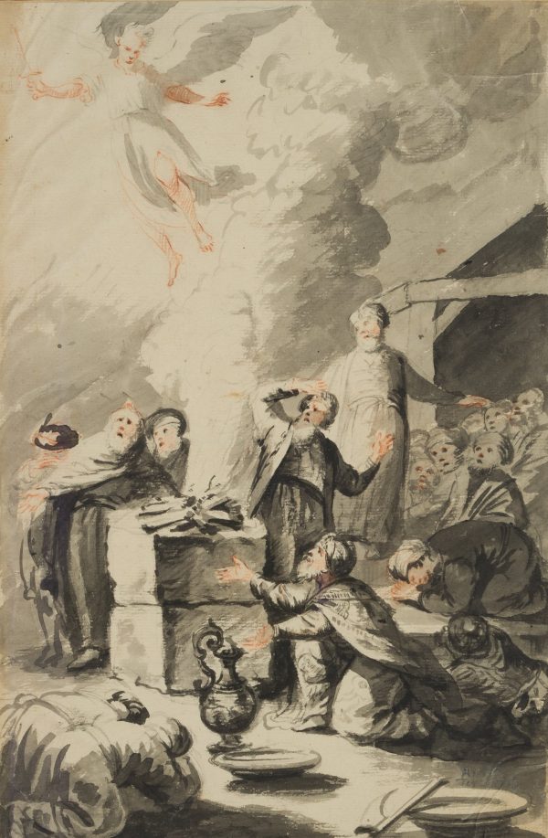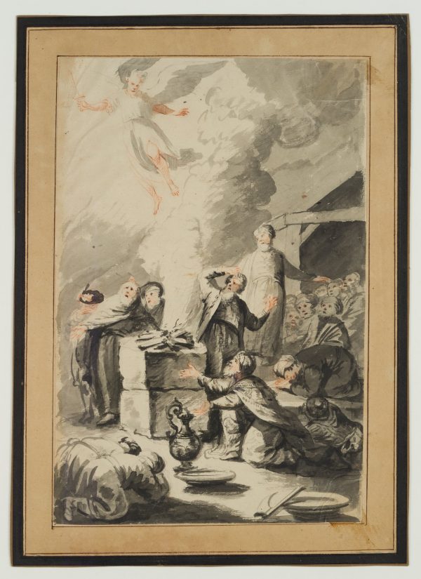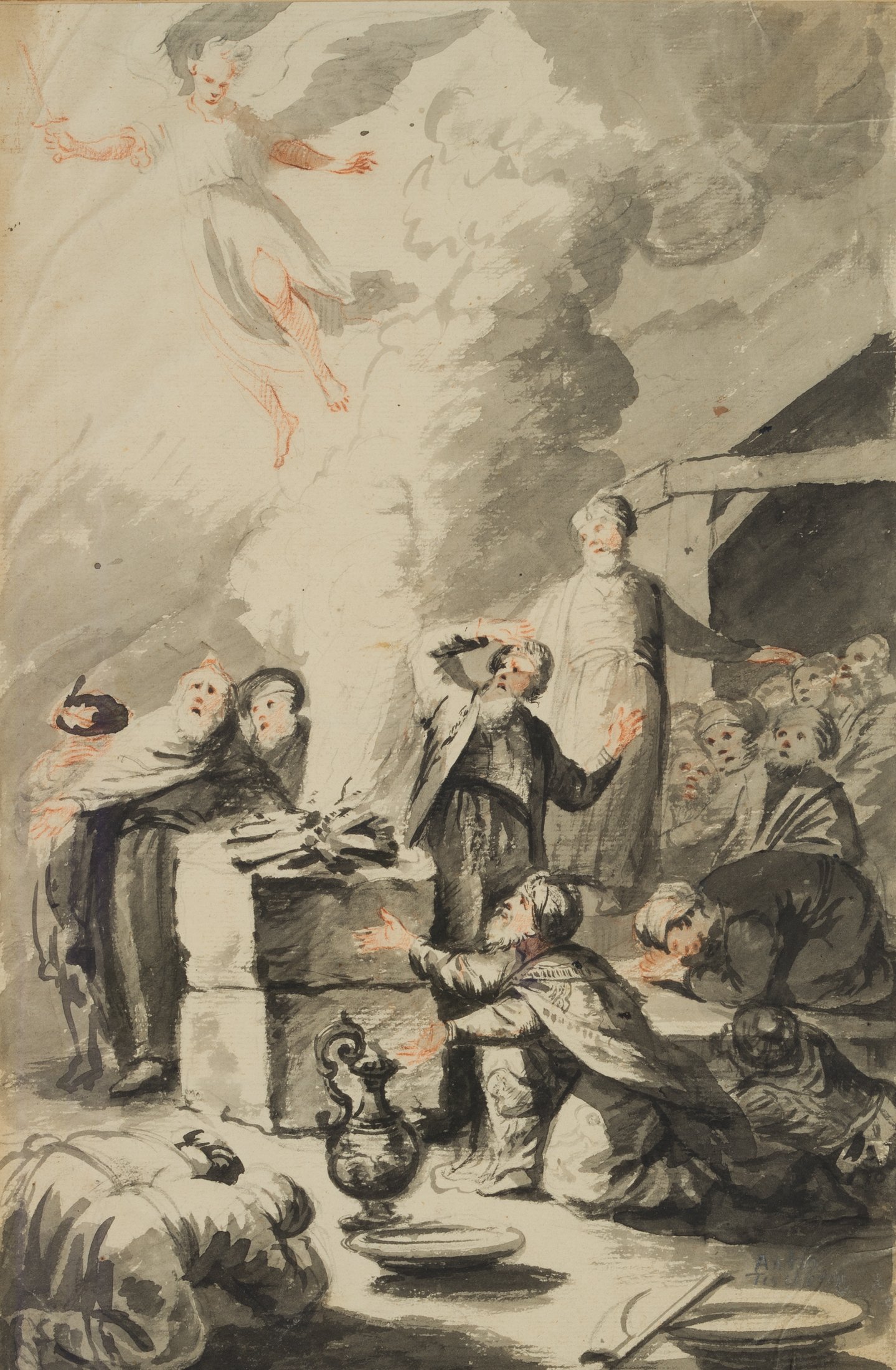 - Keywords: Watercolour, ink, red chalk, wash, sacrifice, fire, smoke, angel, sword, prayer, man, group, turban, priest, 18th century, Classicism, Religious, Germany,