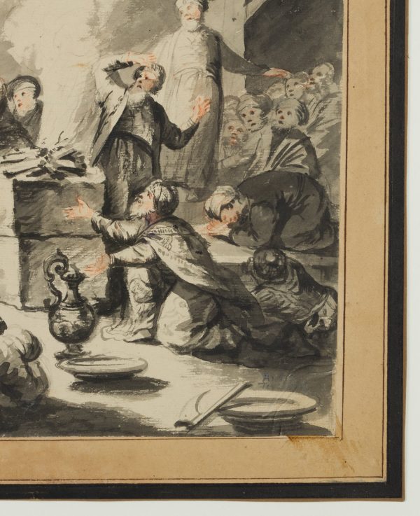 - Schlagworte: Aquarell, Tusche, Rötel, Lavierung, Opfer, Feuer, Rauch, Engel, Schwert, Gebet, Mann, Gruppe, Turban, Priester, Religiös, Deutschland, Klassizismus, 1700-1749