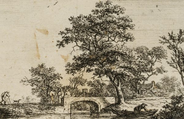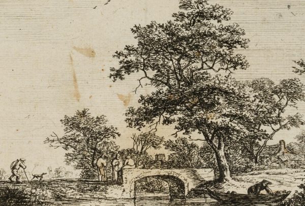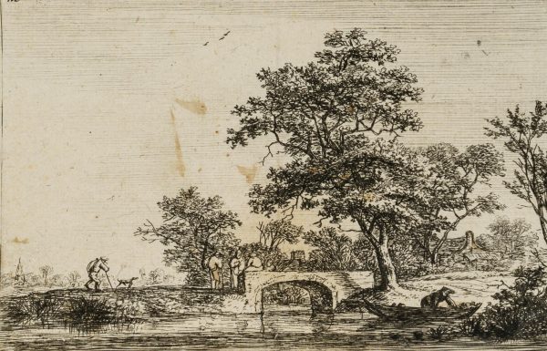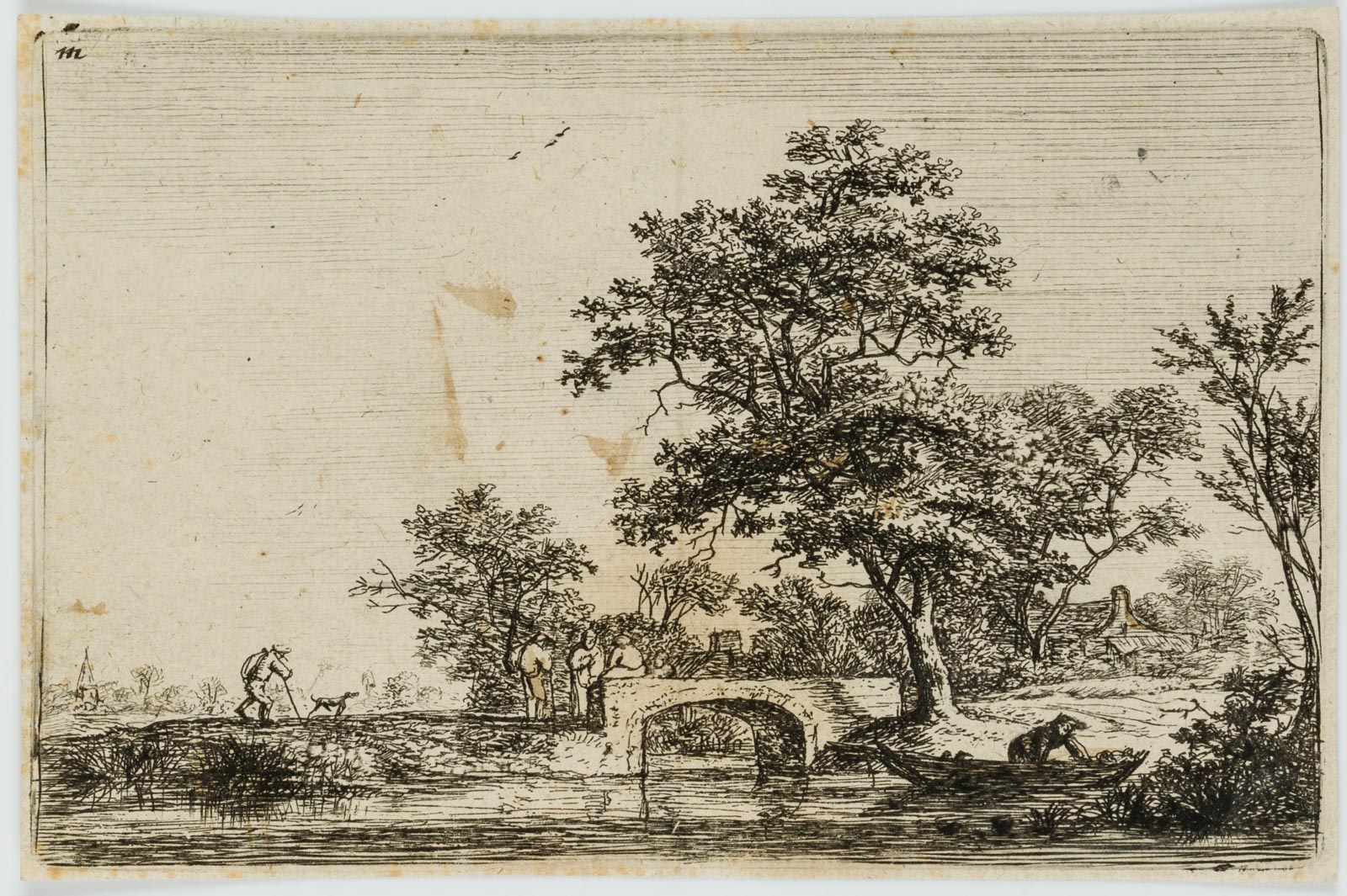 - Beschreibung: Auf einer Brücke hat sich eine Gruppe von drei Landleuten zum Plausch zusammengefunden, ein Wanderer zieht mit seinem Hund umher und ein Bootsfahrer legt am Ufer an. In der Ferne erhebt sich die Silhouette eines Kirchturms.