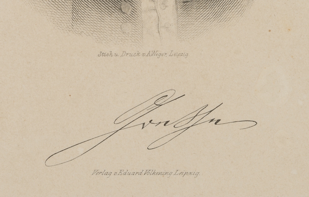 • Bezeichnung: Unterhalb in der Druckplatte bezeichnet und mit der faksimilierten Unterschrift des Dargestellten versehen.