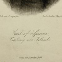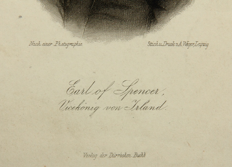 - Inscription: Signed and inscribed “Nach einer Photographie”, “Stich u. Druck v.A.Weger Leipzig”, “Earl of Spencer, Vizekönig von Irland” and “Verlag der Dürr’schen Buchh” below the image in the printing plate.