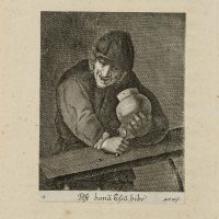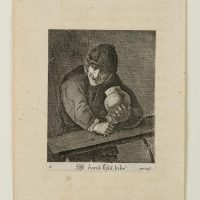 Andreas Matthaus Wolfgang (1660 – 1726 ), Plainly dressed guest in an inn sitting at a table with a jug and spoon, 18th century, Etching