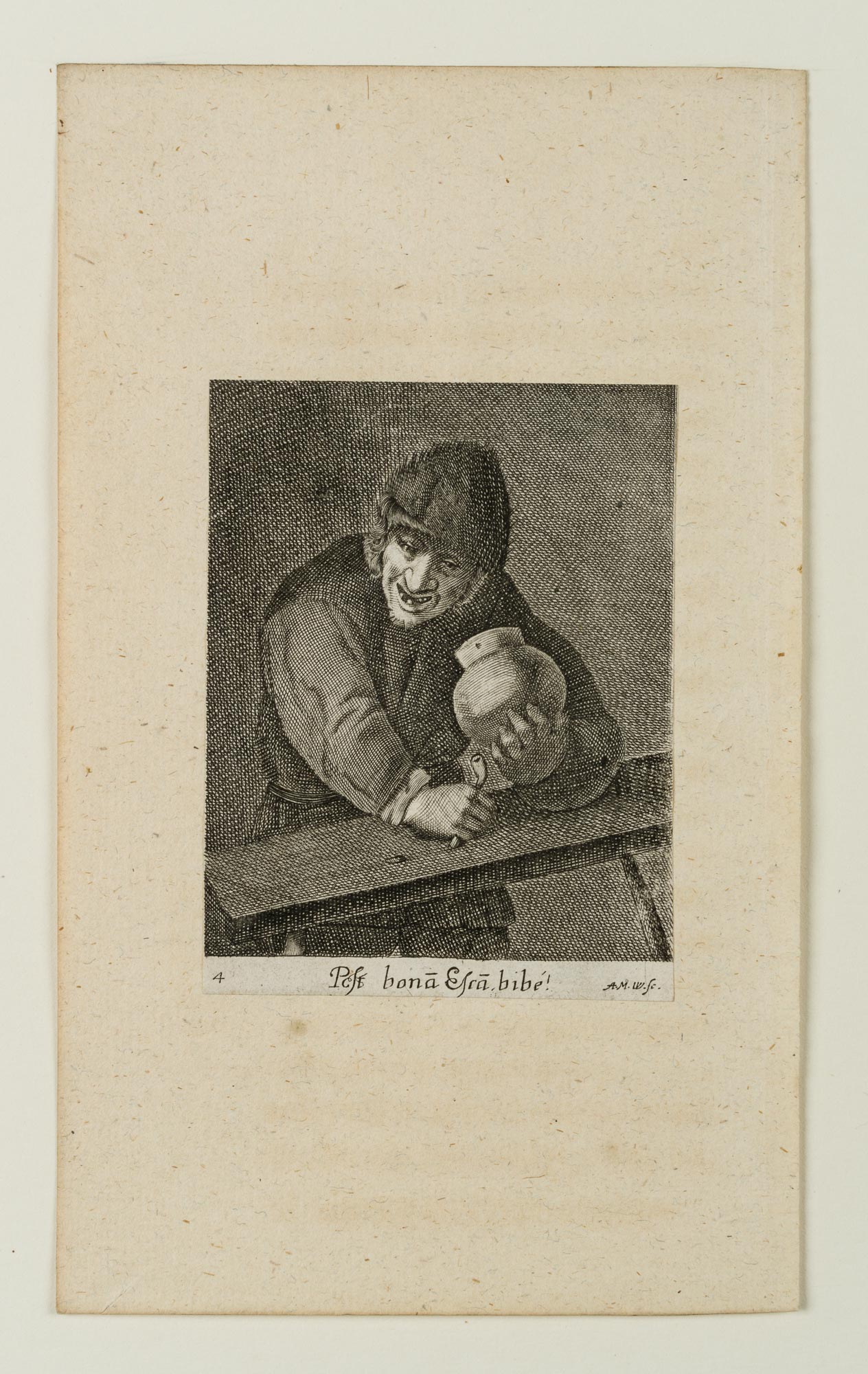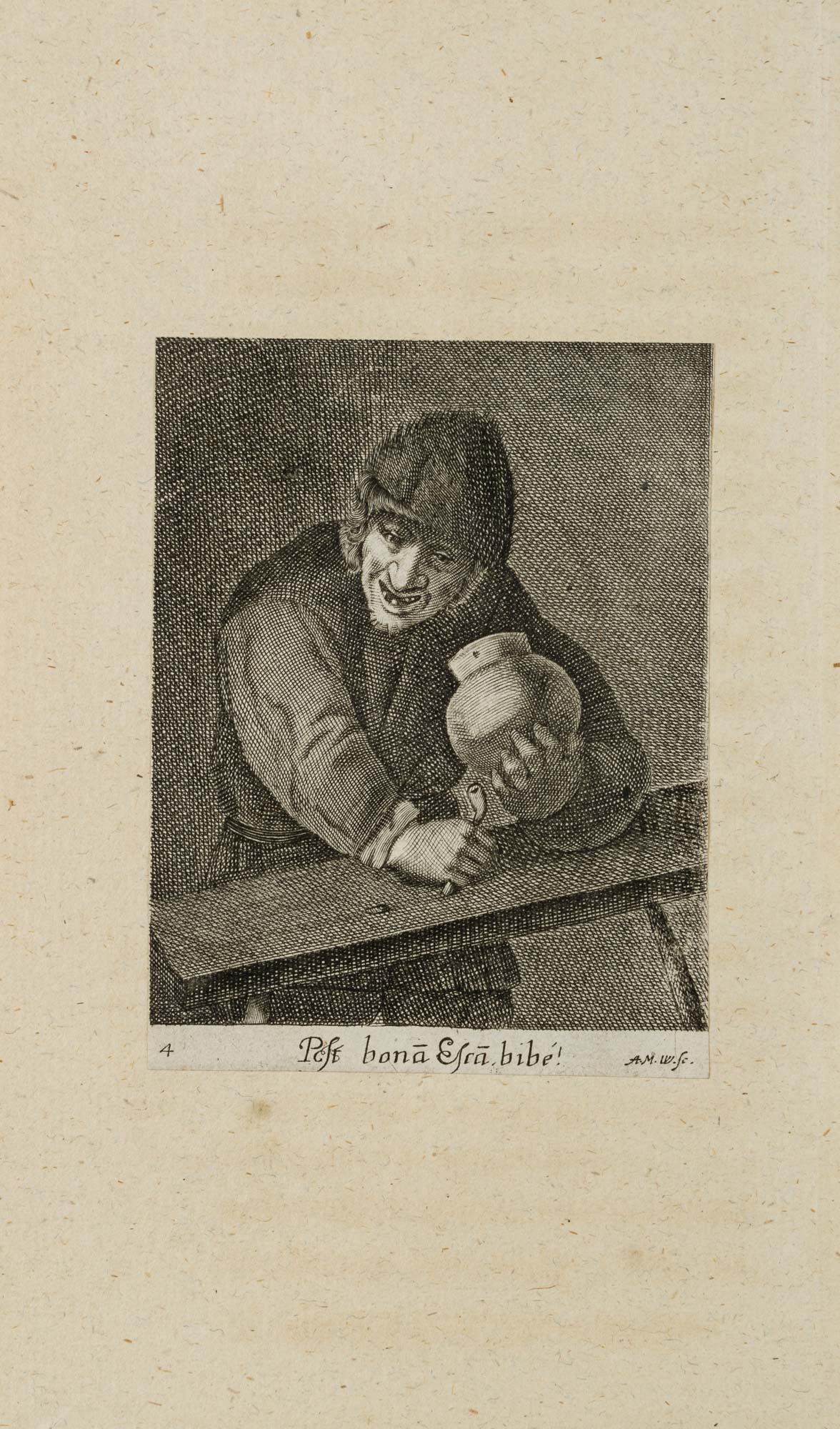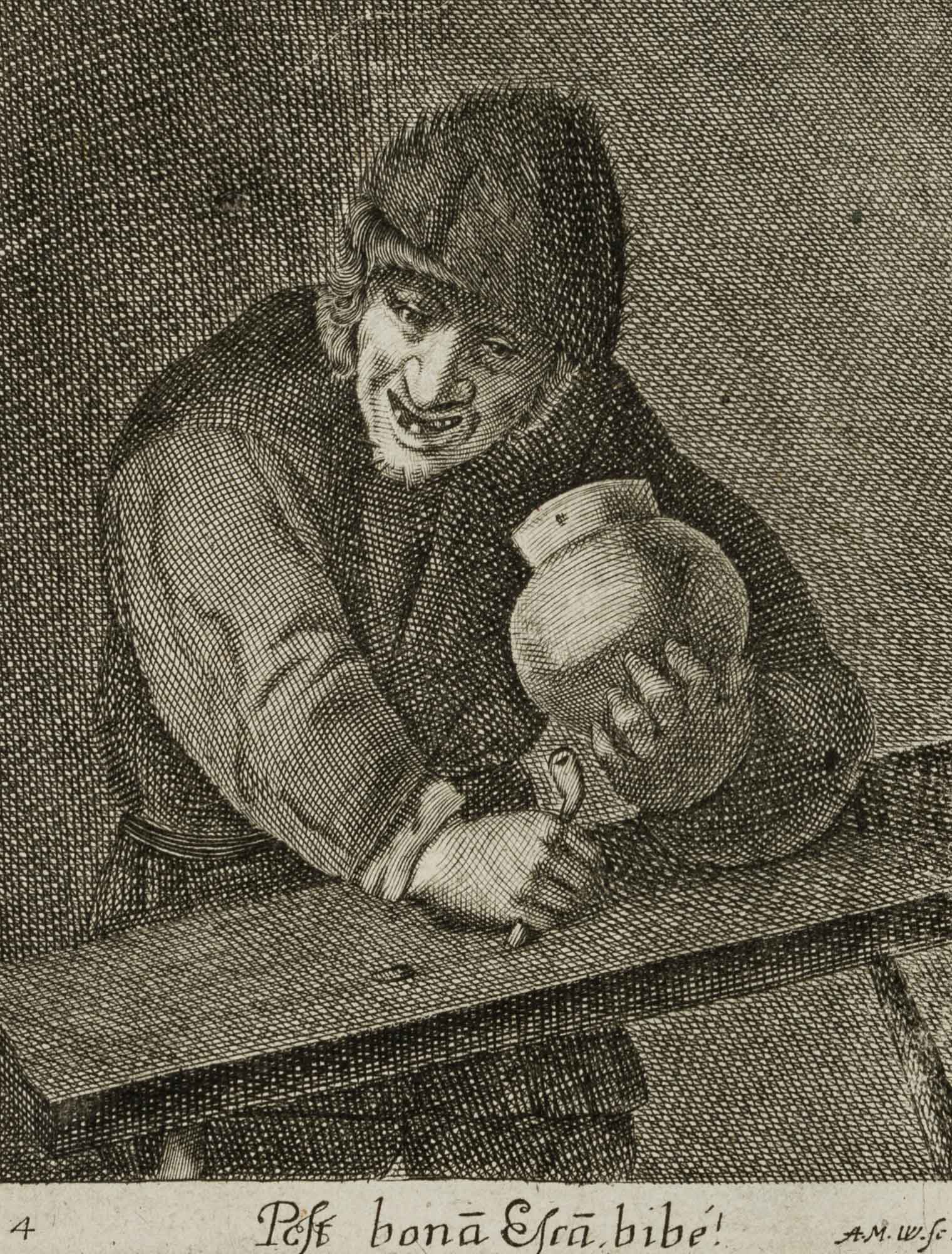- Inscription: Inscribed in Latin below with “Pest bona Esca bibe!”. Signed “A. M. W. sc.” next to it. The sheet bears the number: “4”.