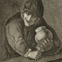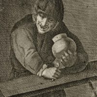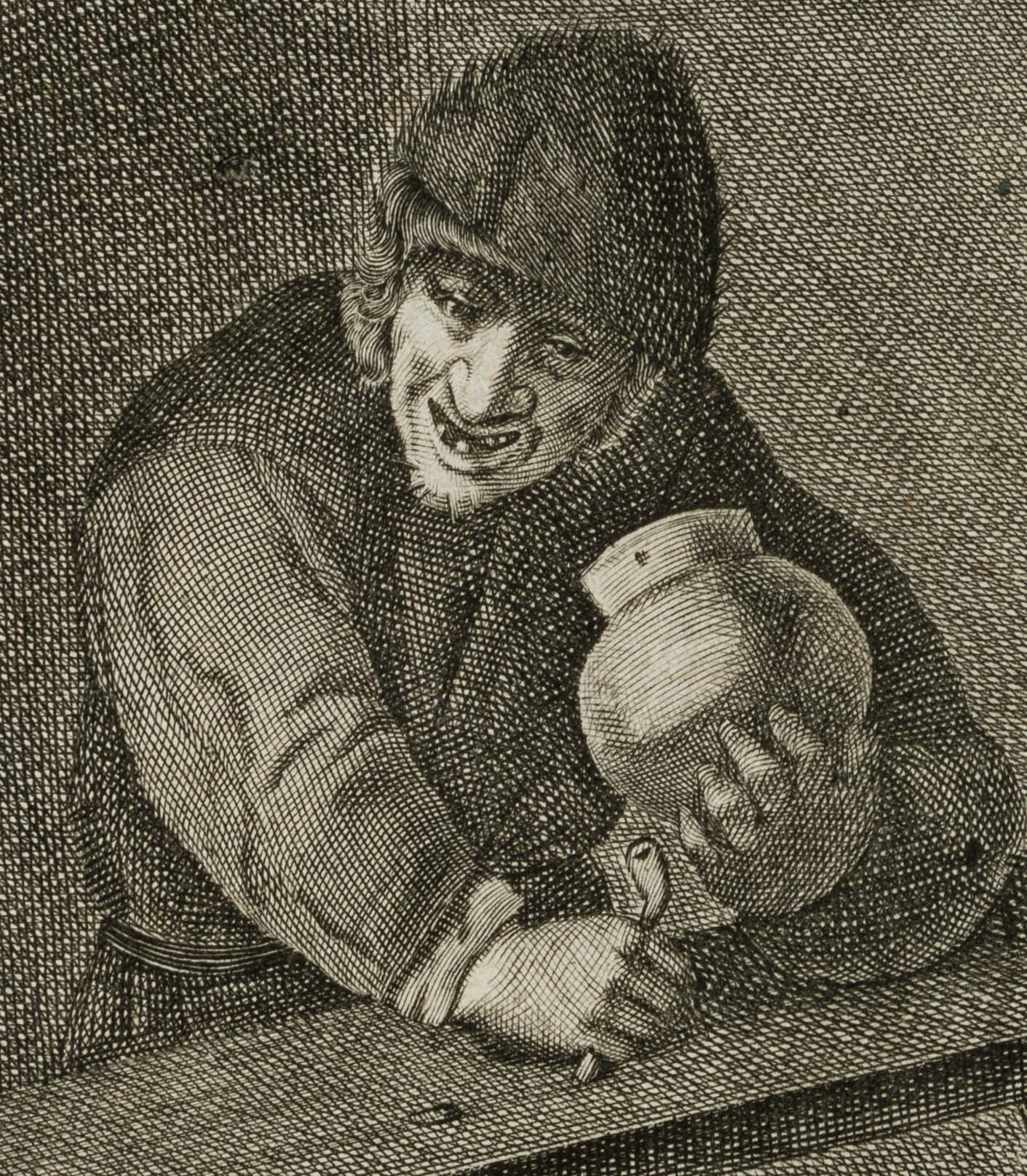 - Beschreibung: Der Gast macht einen betrunkenen Eindruck. Er stützt sich gebeugt auf den Tisch und schaut in seinen Kelch. Sein geöffneter Mund zeigt ein beinahe zahnloses Gebiss.