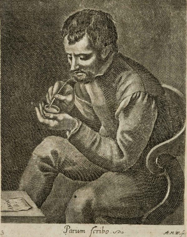 - Bezeichnung: Unterhalb lateinisch beschriftet mit “Parum scribo.”. Daneben mit “A. M. W. sc.” signiert. Das Blatt trägt die Nummer: “3”.
