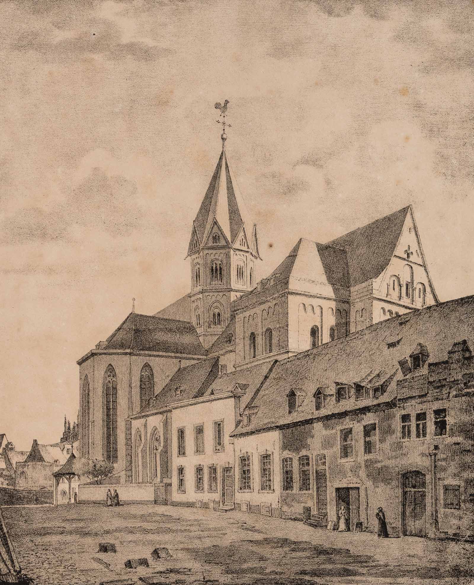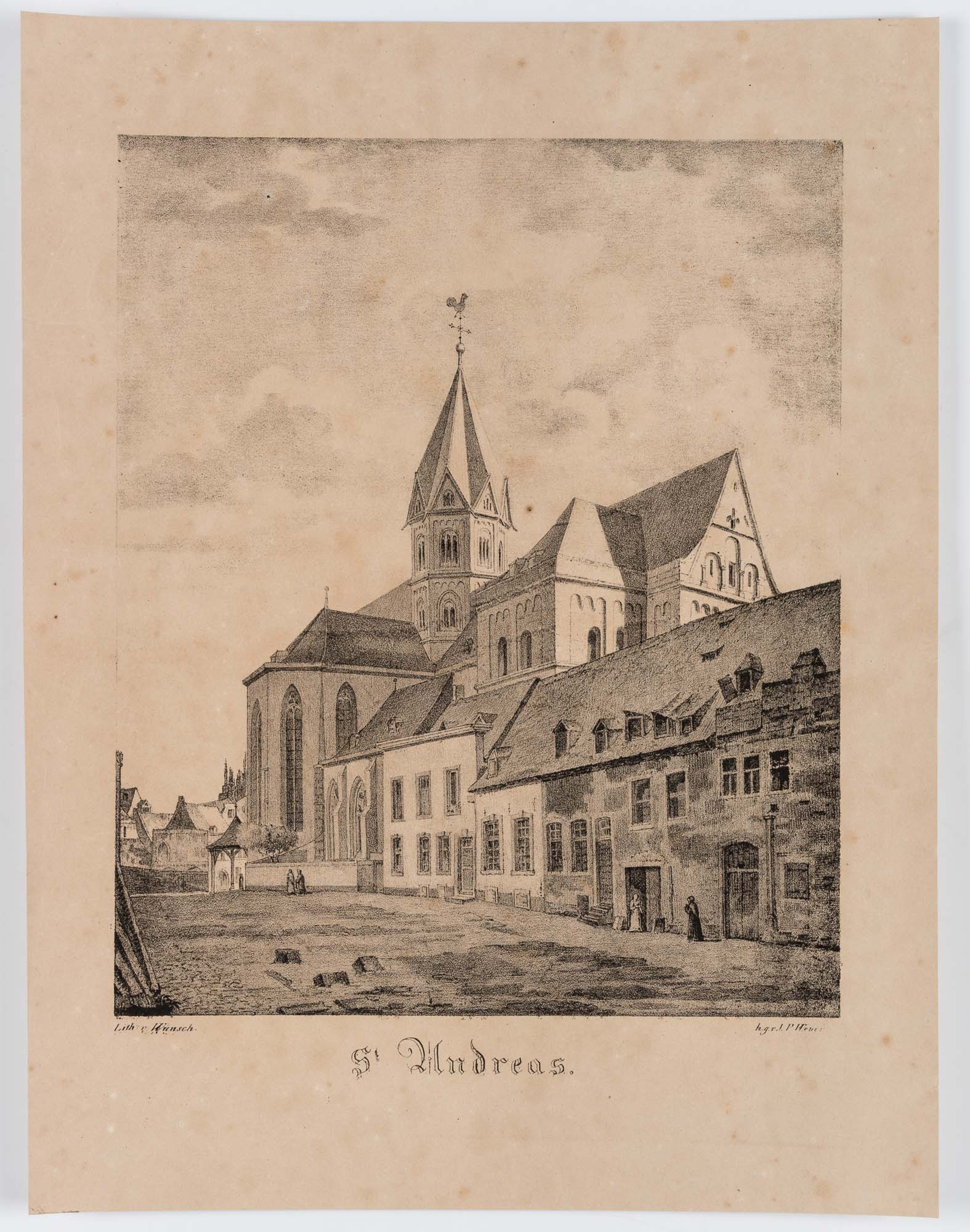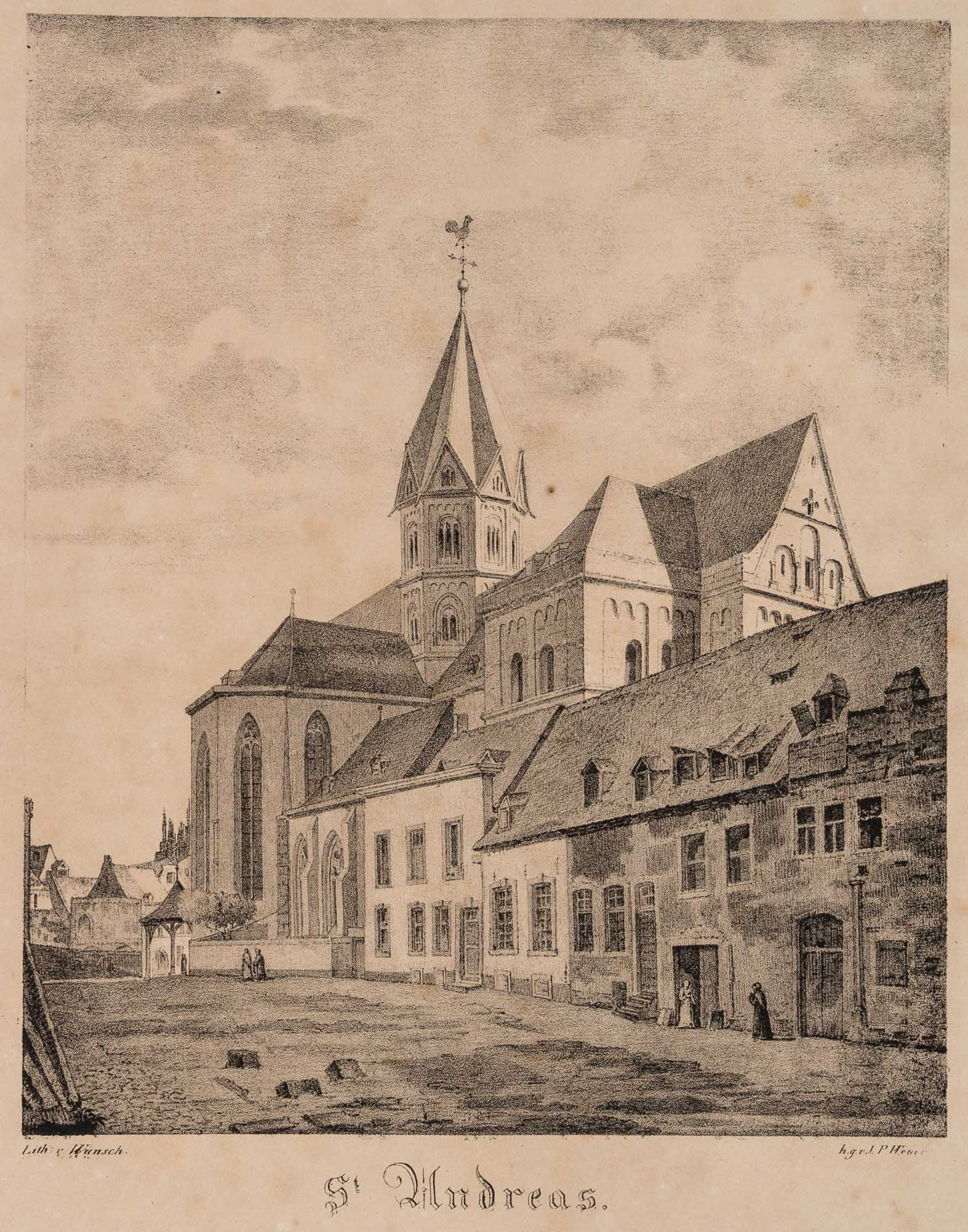 Anton Wünsch (1800 Bad Godesberg – 1833 Köln), Blick auf die romanische Basilika St. Andreas, Köln, aus J.P. Weyer, Sammlung von Ansichten öffentlicher Plätze, merkwürdiger Gebäude und Denkmäler in Köln b. J. P. Bachem, Köln, 1827, Lithographie