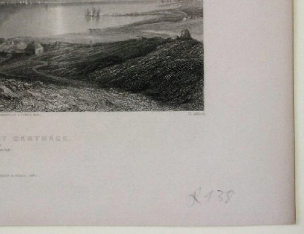 - Beschreibung: H. Adlard, Die Ruinen von Karthago, Stahlstich nach J. Salmon, 1840. Beschreibung: Qualitätsvoller Stahlstich von H. Adlard nach J. Salmon, bezeichnet: “J. Salmon Drawn from Nature by Sir Grenville T. Temple Bar H. Adlard The Ruins of Carthage Africa Fisher, Son&C°. London & Paris, 1840”. Von leicht erhöhtem Standpunkt blickt der Betrachter auf die ruhige See. Im Vordergrund ruhen drei Männer, sie nehmen stellvertretend den Platz des Betrachters im Bild ein. Eine Bergkette, die sich zu einem hohen Berg auftürmt, liegt vor dem niedrigen Horizont auf dem jenseitigen Ufer. Henry Adlard (erste Erwähnugn in London 1801) war britischer Kupferstecher.