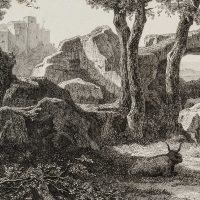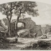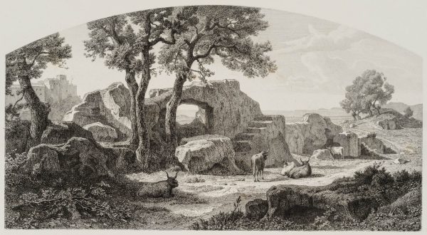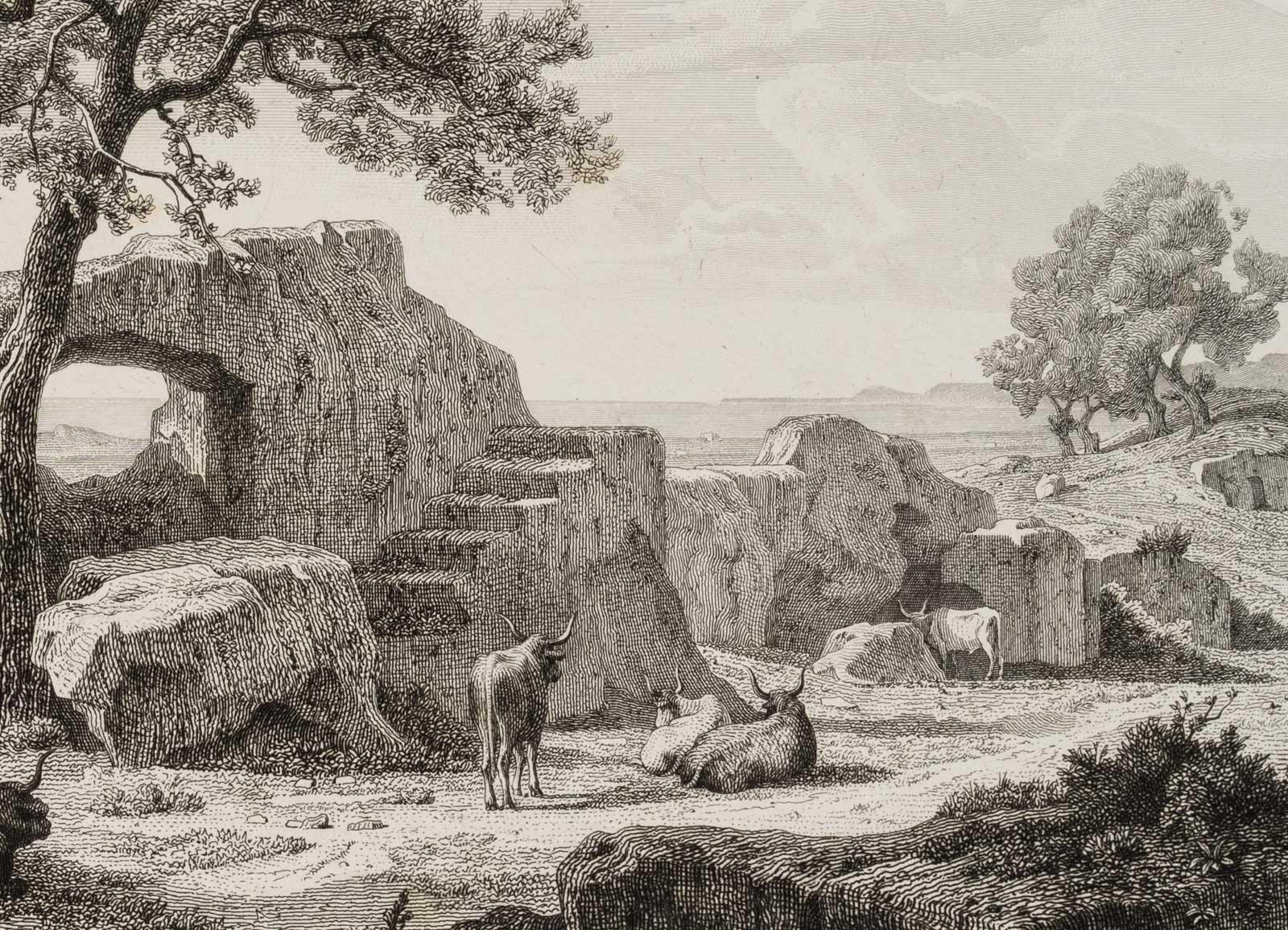 Wonderful view from the fourteen-part series of Views of Greece and Italy etched by Eugène Adler-Mesnard after models by Wilhelm Klose and published by Kaeser Verlag in 1880. The vedute of classical-antique sites in Greece and Italy were executed as wall paintings in the Villa Klose in Karlsruhe and show remarkable antiquities and buildings of the Mediterranean region in their characteristic landscape surroundings. In mostly deserted, barren rocky landscapes, the imposing buildings stage themselves as imperishable cultural monuments of almost timeless historicity.