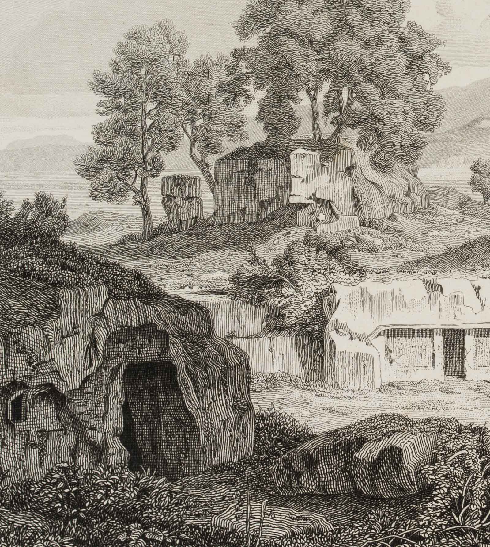 Wunderschöne Ansicht aus der vierzehnteiligen Serie der Ansichten von Griechenland und Italien, die Eugène Adler-Mesnard nach Vorbildern Wilhelm Kloses radiert hat und die 1880 im Kaeser Verlag erschienen ist. Die Veduten klassisch-antiker Stätten in Griechenland und Italien wurden als Wandgemälde in der Villa Klose in Karlsruhe ausgeführt und zeigen bemerkenswerte Altertümer und Bauwerke des Mittelmeerraumes in ihrer charakteristischen landschaftlichen Umgebung. In zumeist menschenleeren, kargen Felslandschaften inszenieren sich die imposanten Bauten zu unvergänglichen Kulturdenkmälern beinahe zeitloser Historizität.