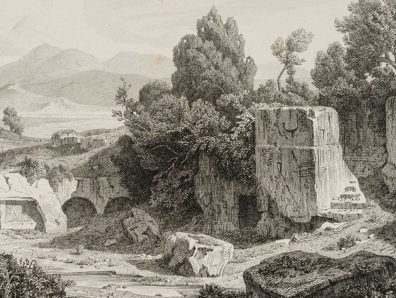 Wonderful view from the fourteen-part series of Views of Greece and Italy etched by Eugène Adler-Mesnard after models by Wilhelm Klose and published by Kaeser Verlag in 1880. The vedute of classical-antique sites in Greece and Italy were executed as wall paintings in the Villa Klose in Karlsruhe and show remarkable antiquities and buildings of the Mediterranean region in their characteristic landscape surroundings. In mostly deserted, barren rocky landscapes, the imposing buildings stage themselves as imperishable cultural monuments of almost timeless historicity.