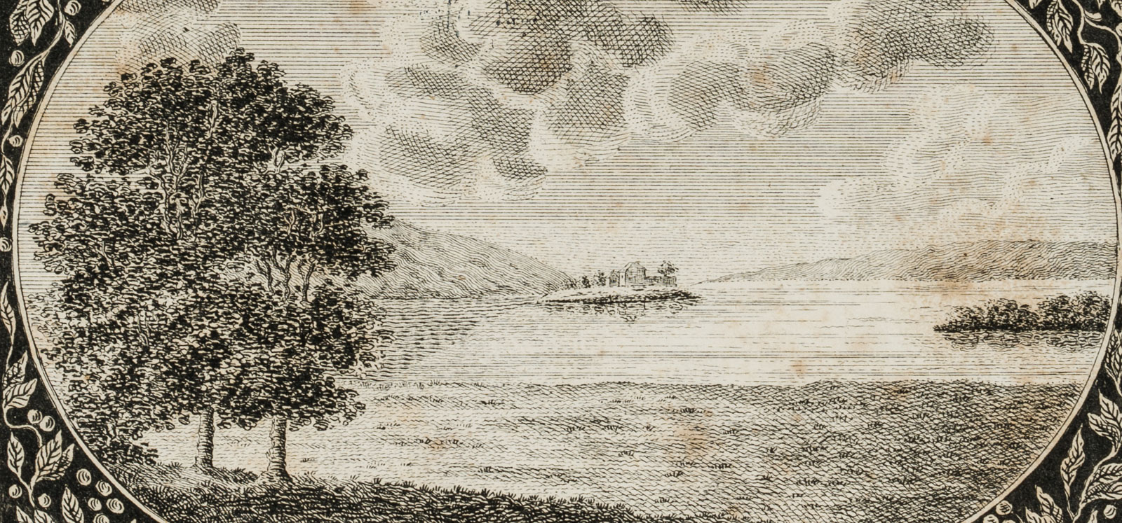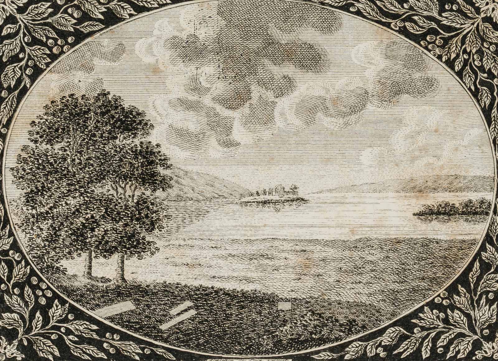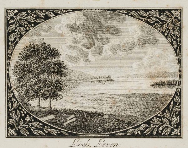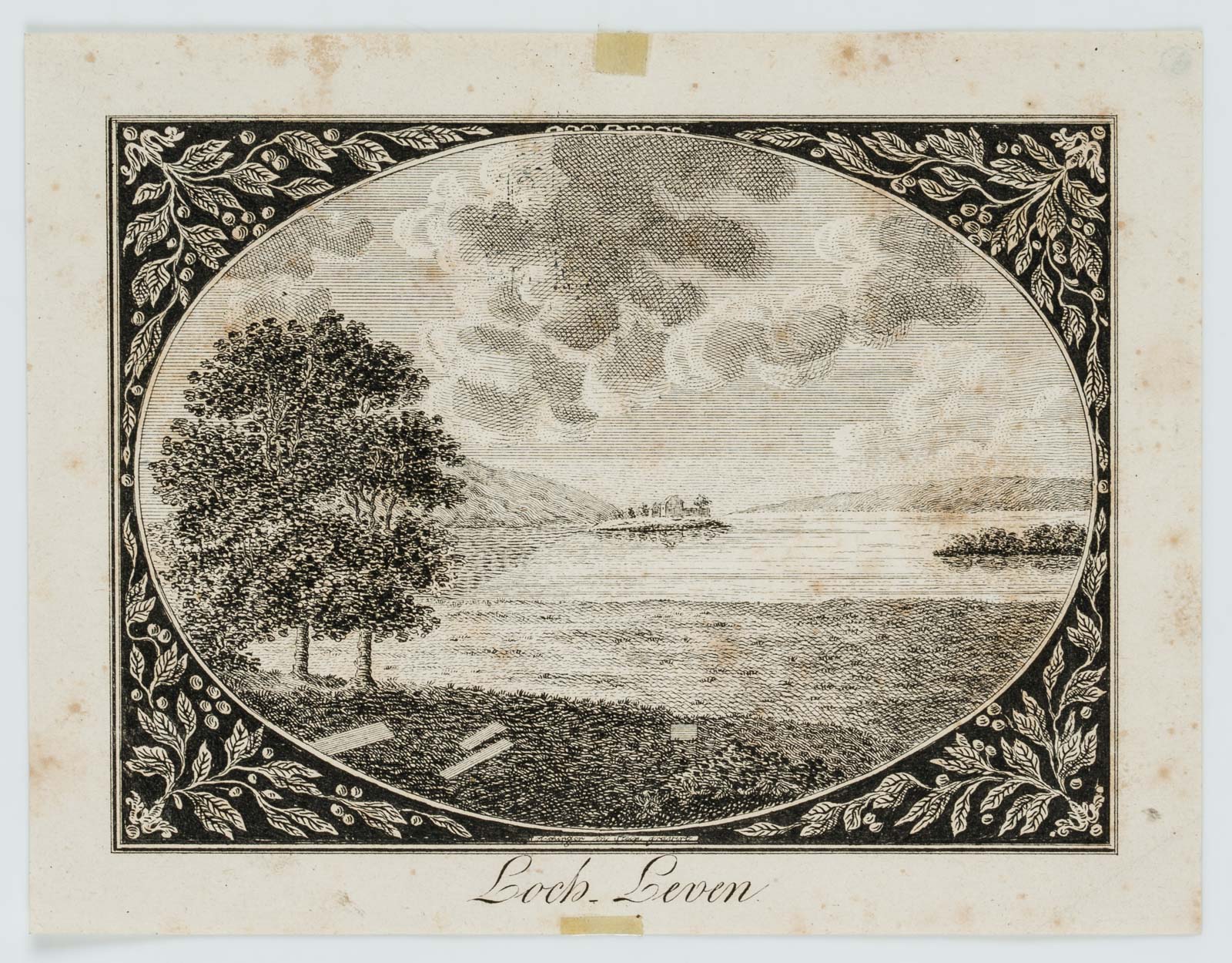 Die pittoreske Landschaftsdarstellung im Oval zeigt Loch Leven, den Seitenarm (sea loch) der Meeresbucht Loch Linnhe. Er liegt an der Westküste Schottlands. Bei Loch Leven Castle handelt es sich um eine Burgruine auf einer Insel im Loch Leven. Die Burg erreichte durch die Gefangenschaft und Flucht von Maria Stuart in den Jahren 1567/68 größere Bekanntheit. - Datierung: 18. Jahrhundert