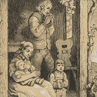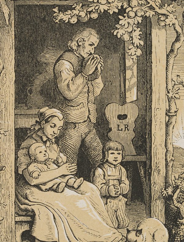 - Description: Family scene in silent prayer at the entrance to the house. On the left a guardian angel.