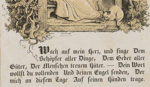 - Inscription: Signed in the printing plate: “LR / Allanson”. At the lower part inscribed in the printing plate: “Wach auf mein Herz, und singe Dem Schöpfer aller Dinge […]”.