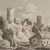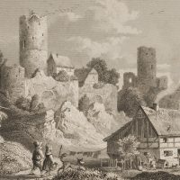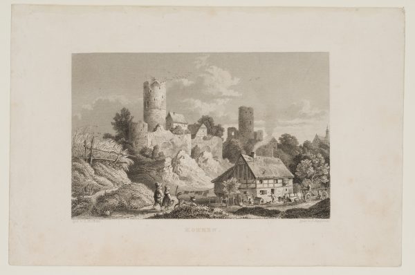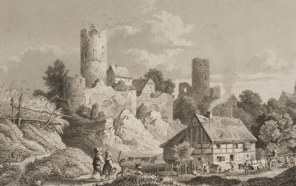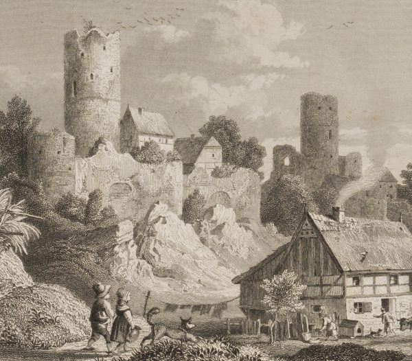J.W. Appleton (19th century) after Ludwig Richter (1803 Dresden – 1884 ibid.), View of the Kohren castle ruins from the country road with strollers and half-timbered house, Leipzig, Saxony, c. 1850, Steel engraving