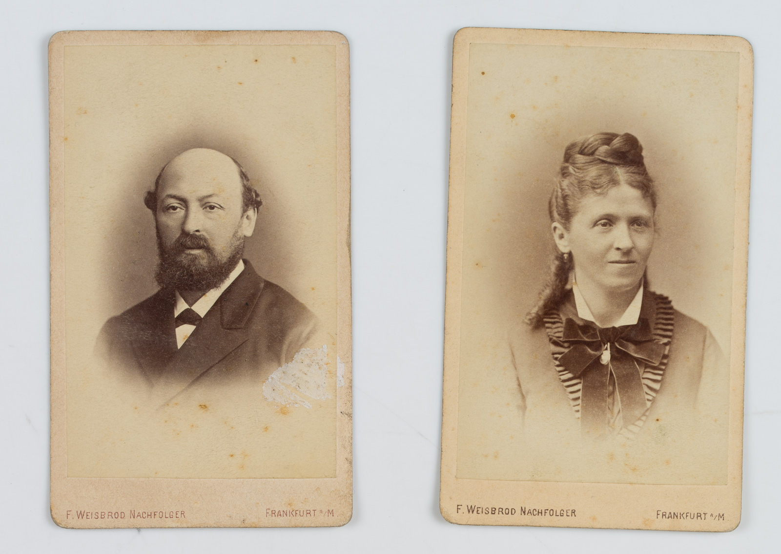 Atelier F. Weisbrod (19. Jahrhundert) Nachfolge, 2 Cartes de Visite. Portrait einer Dame mit großer Schleife. Portrait eines Herren im Anzug mit Vollbart, 19. Jahrhundert, Original-Fotografie