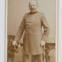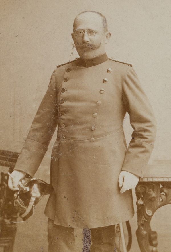 Atelier Fritz Hoefle (19. Jahrhundert), Portrait eines preussisch Uniformierten mit Schnauzer und Brille und Pickelhaube in der Hand, um 1886, Original-Fotografie