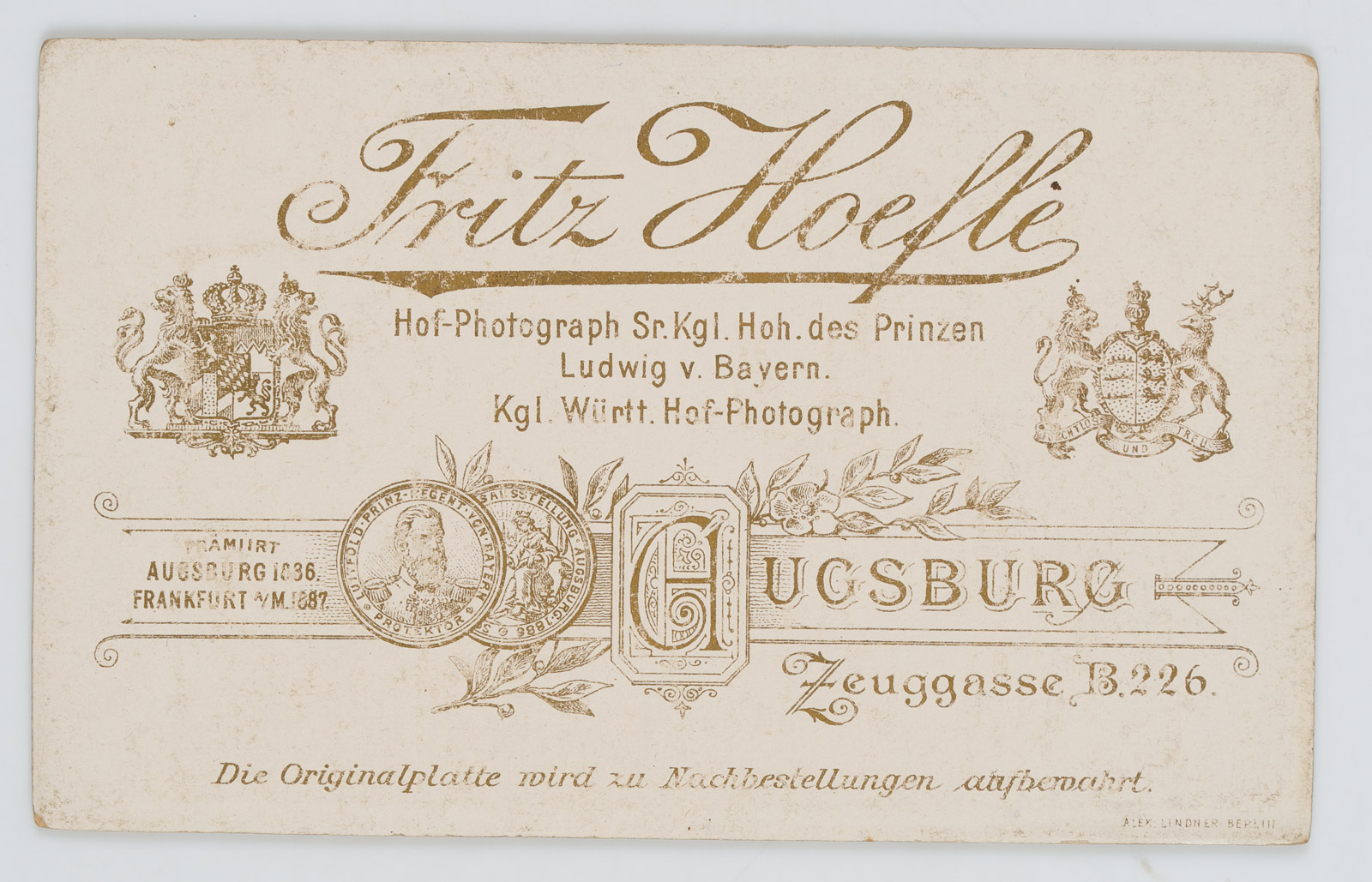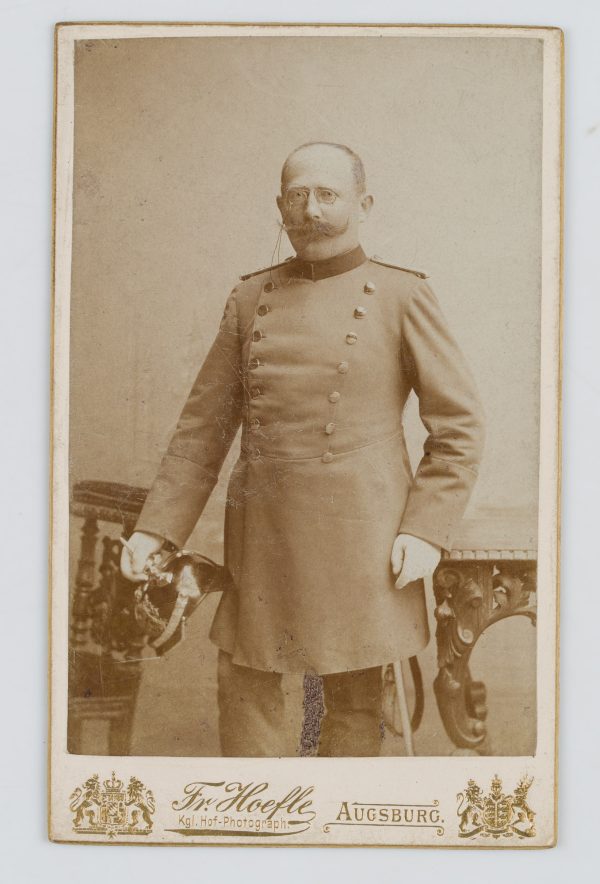 - Beschreibung: Die Fotografie ist unterhalb beschriftet mit der Adresse des Fotografen: “Fr. Hoefle Kgl. Hof-Photograph. Augsburg”.