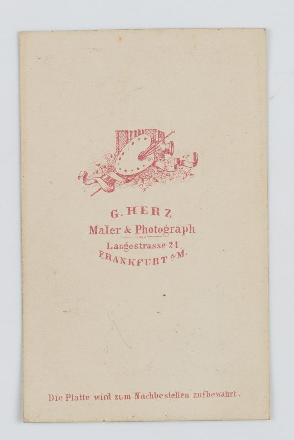 - Beschreibung: Rückseitig mit Name, Signet und Adresse des Fotoateliers. Das Signet zeigt eine Banderole um Pinsel, Malpalette und Kamera. G. Herz ist Maler und Fotograf und hat ein Atelier in Frankfurt. Laut Adresse und Signet, scheint der Künstler das traditionelle künstlerische Handwerk der Malerei mit der modernen automatischen Technik der Fotoaufnahme zusammengebracht zu haben.
