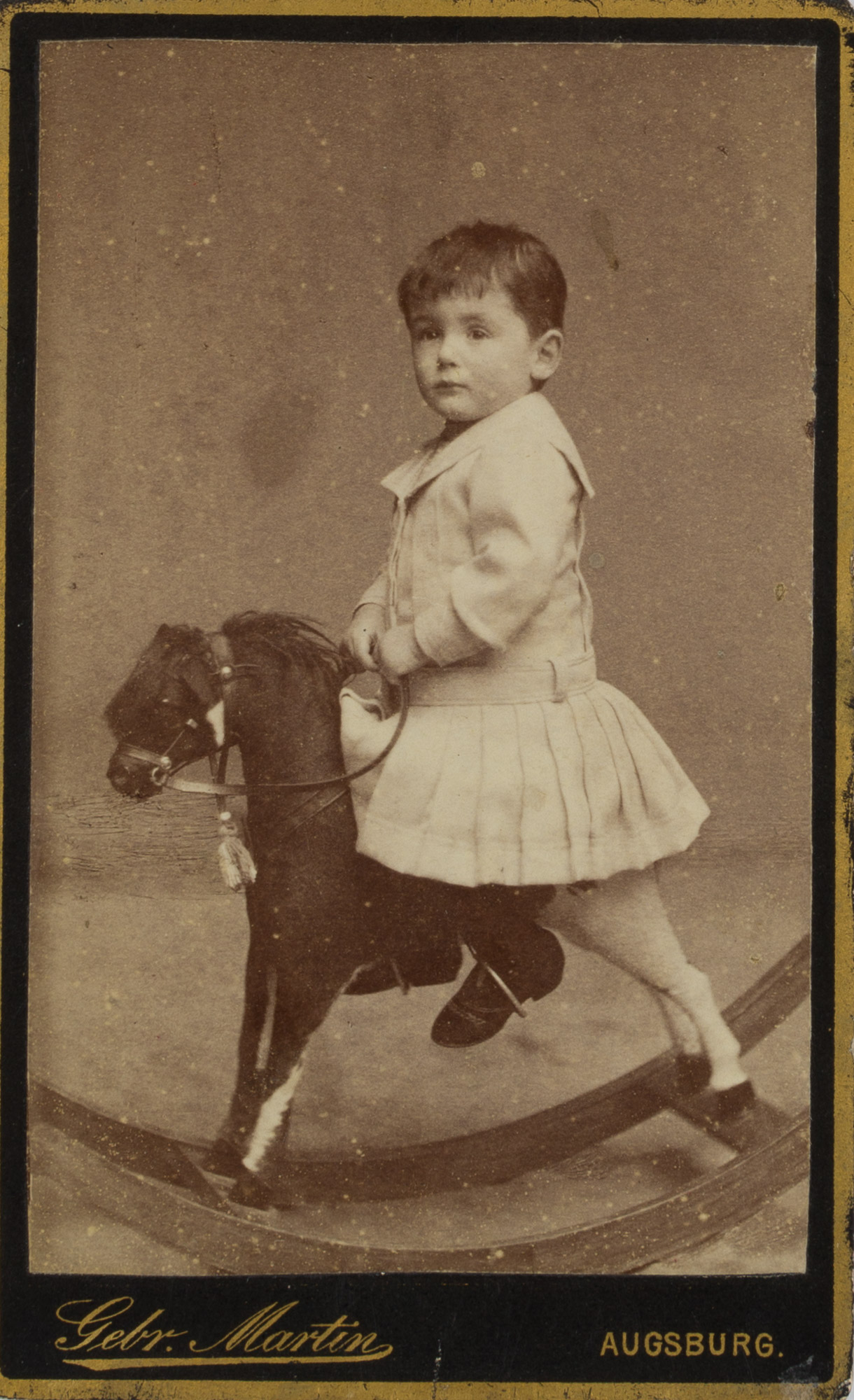 - Description: Royal Bavarian Court Photographers with studio in Munich and Augsburg, Bahnhofstraße. The rocking horse boy is handwritten on the reverse.