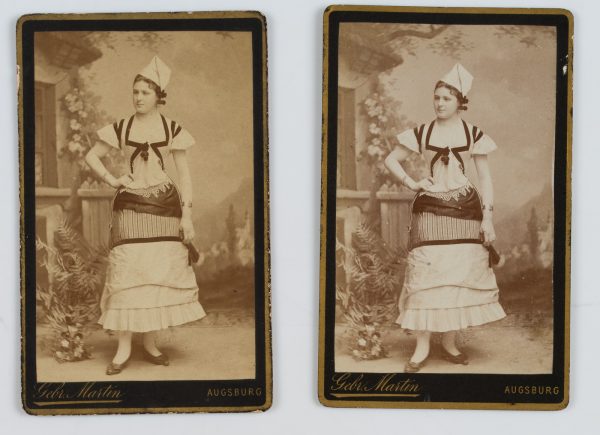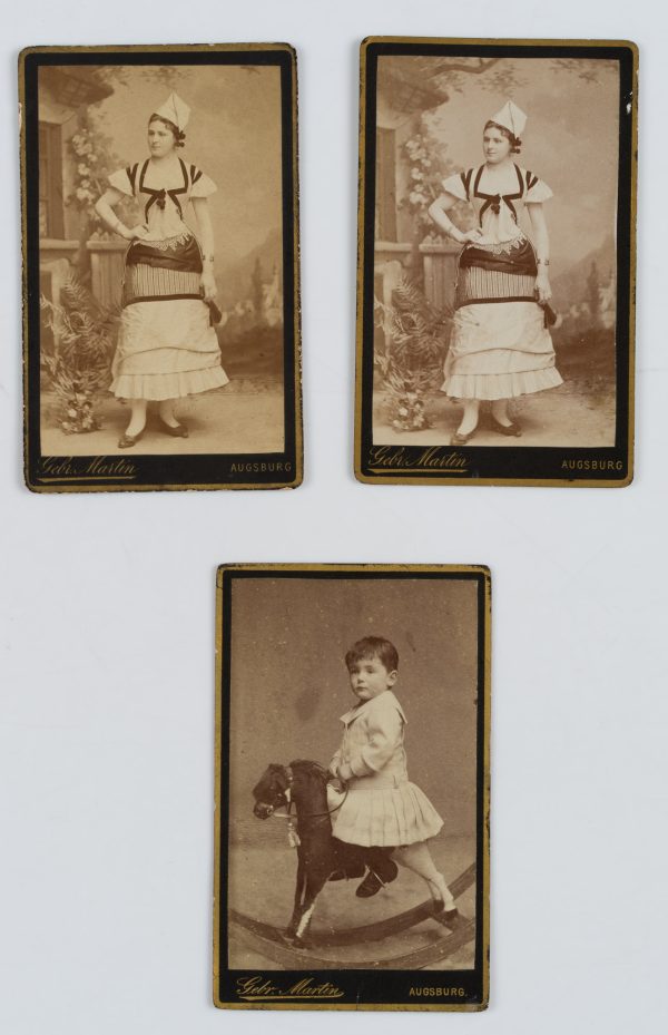 Atelier Gebrüder Martin (19th century), 3 Cartes de Visite. Portrait of a lady, double, in traditional costume and boy on rocking horse, 1888, Original-Photograph