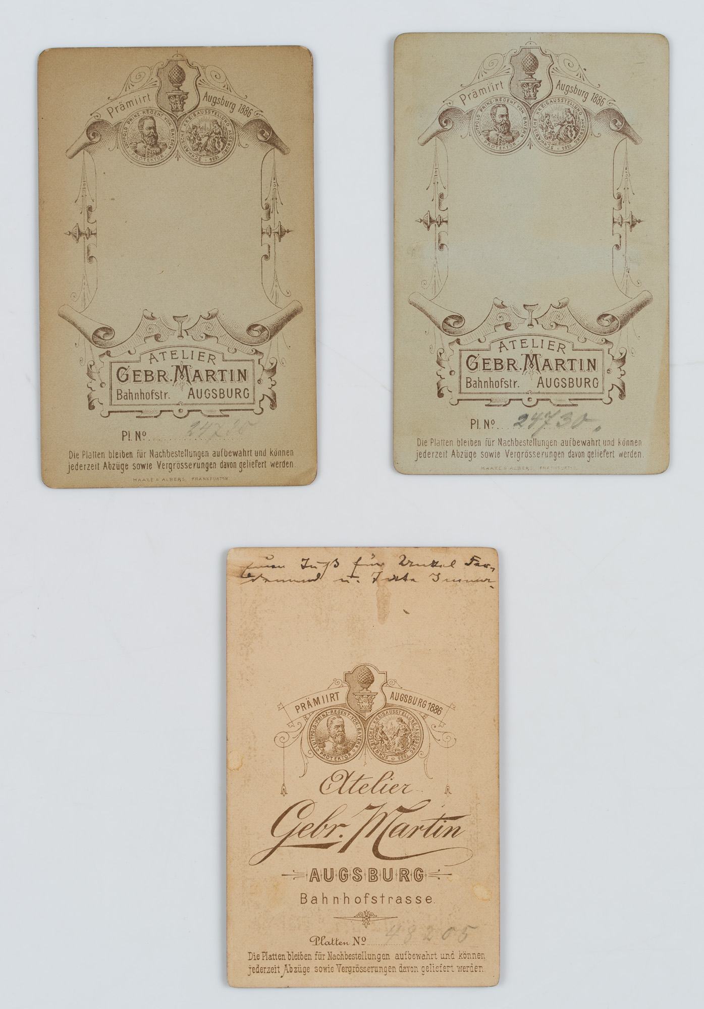 Atelier Gebrüder Martin (19. Jahrhundert), 3 Cartes de Visite. Damenportrait, doppelt, in Tracht und Knabe auf Schaukelpferd, 1888, Original-Fotografie