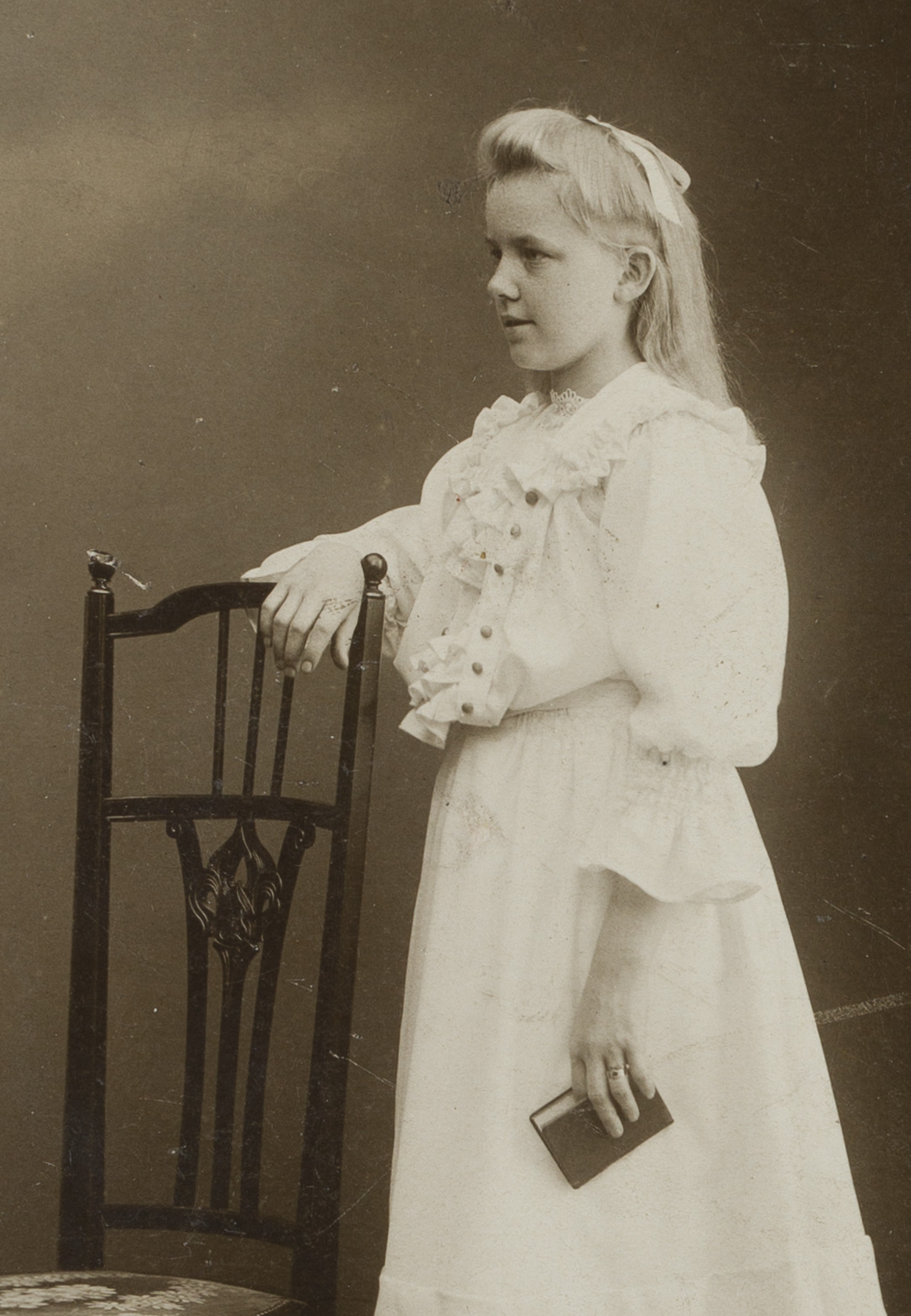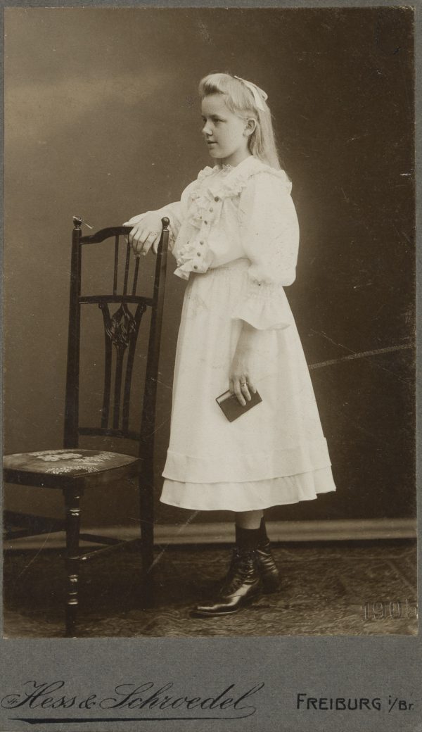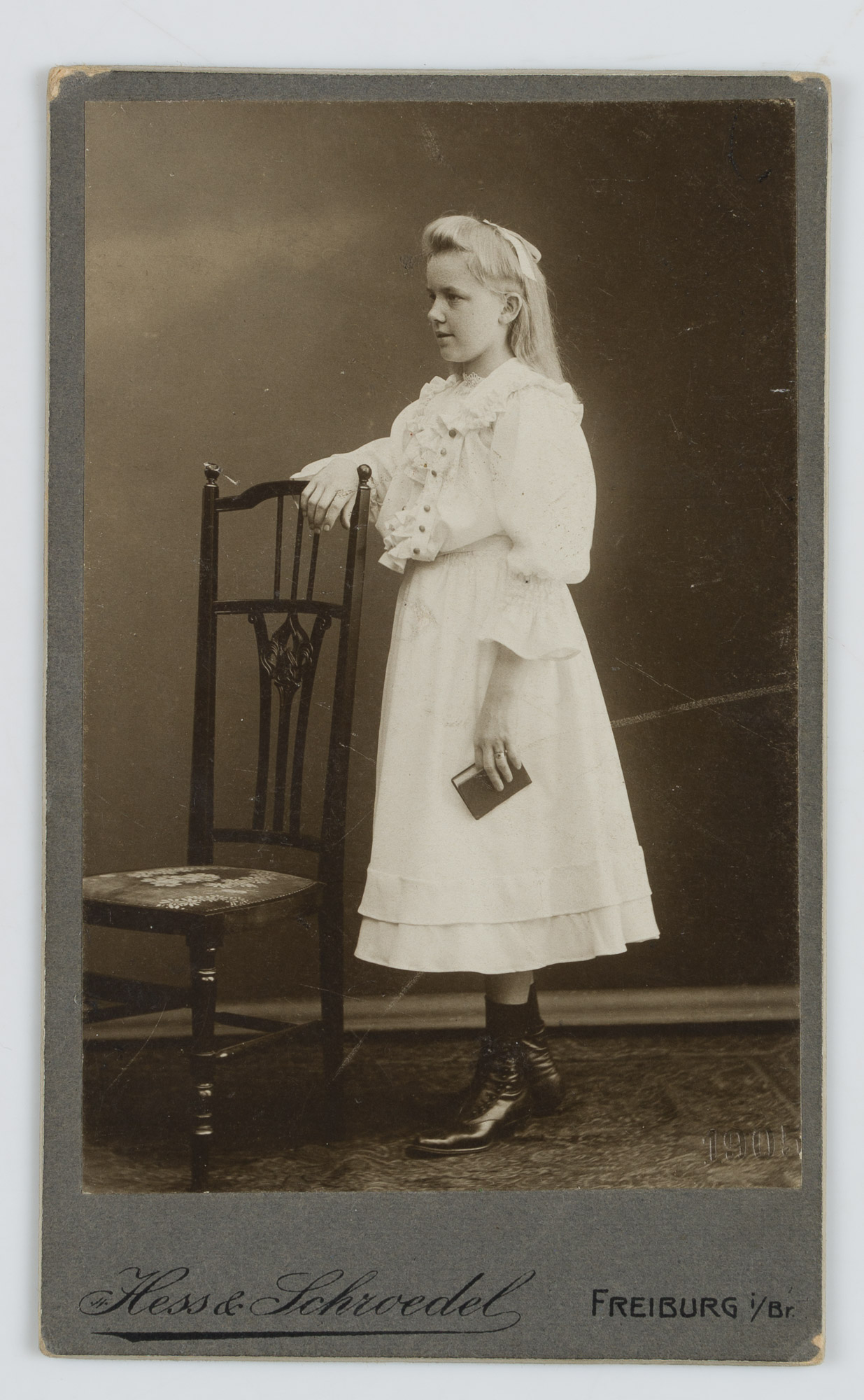 Atelier Hess & Schwedel (19. Jahrhundert), Portrait einer Konfirmierten mit Buch, sich auf eine Stuhllehne stützend, 1905, Original-Fotografie