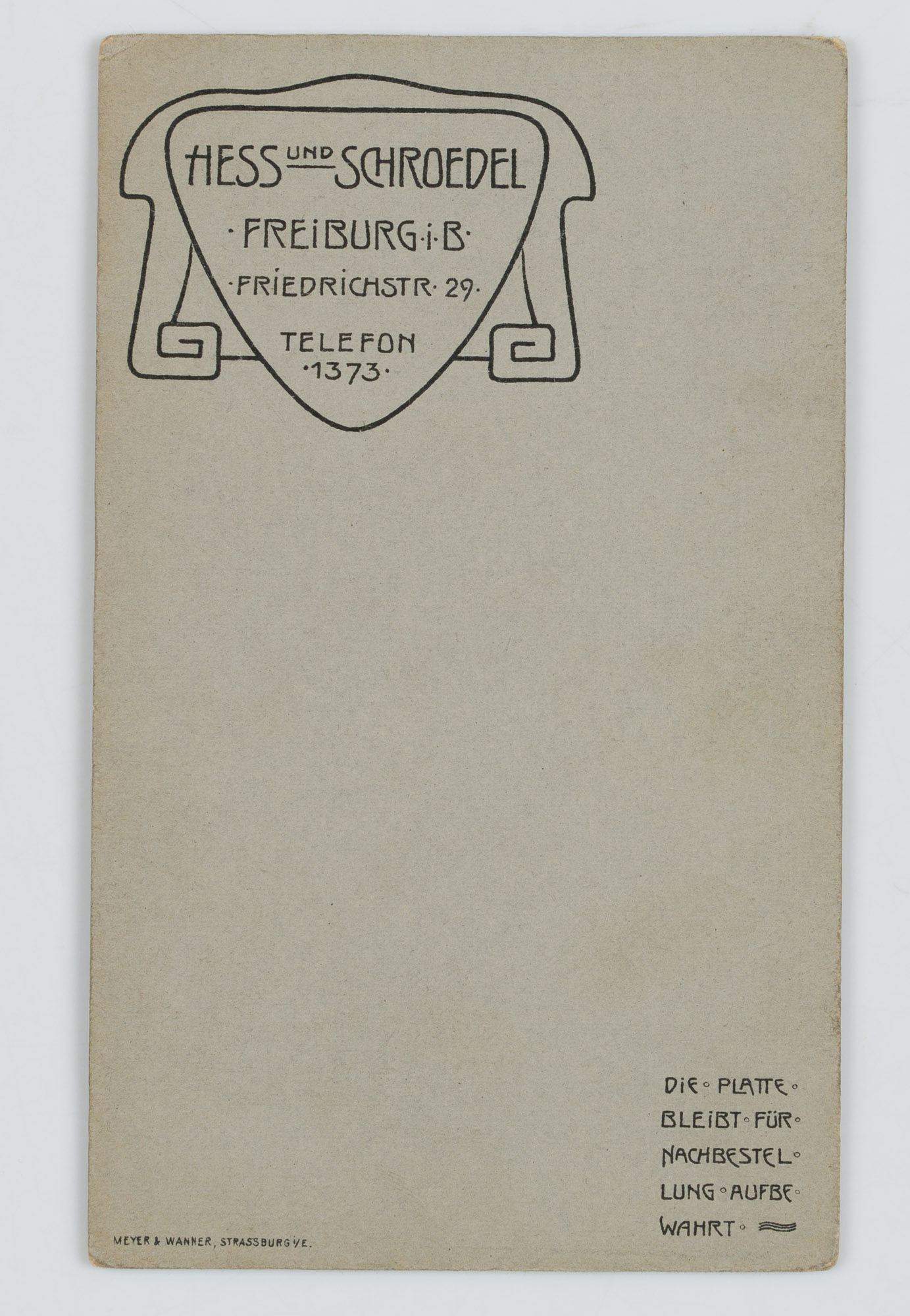 - Bezeichnung: Unterhalb und rückseitig mit Namen und Adresse des Fotografen beschriftet: Hess & Schwedel in Freiburg. Rechts unten mit geprägter Datierung.