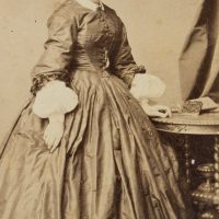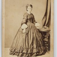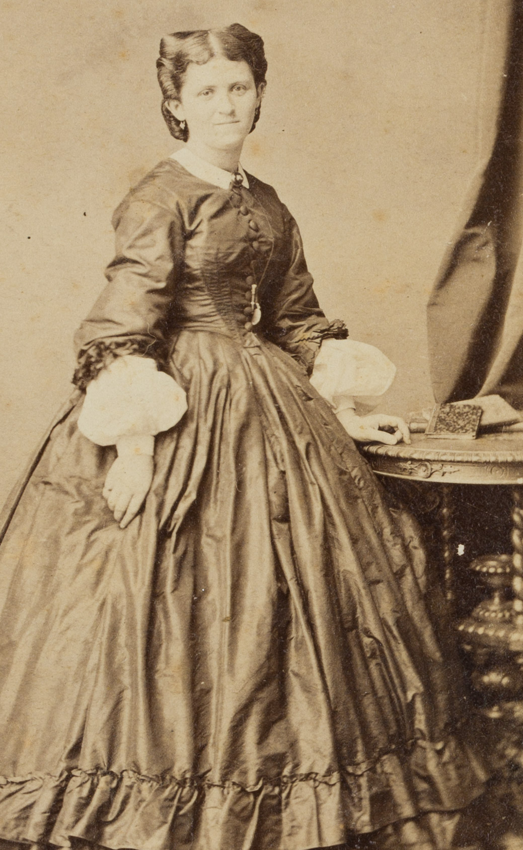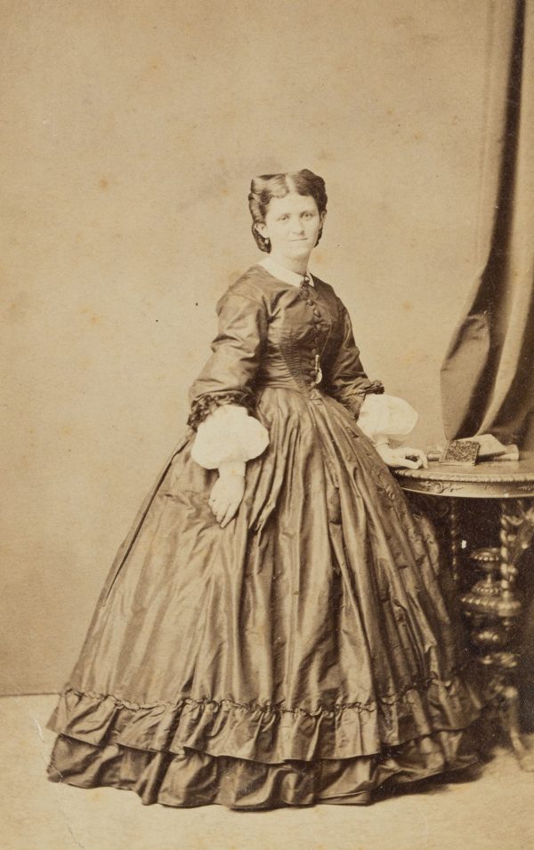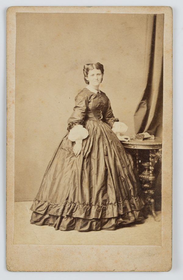 Atelier J. Schaefer (19th century), Portrait of a Lady in an Elegant Dress with a Flared Skirt Standing Next to a Table, 19th century, Original-Photograph
