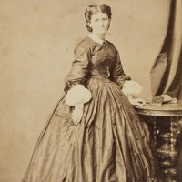 Atelier J. Schaefer (19. Jahrhundert), Portrait einer Dame im eleganten Kleid mit ausladendem Rock neben einem Tisch stehend, 19. Jahrhundert, Original-Fotografie