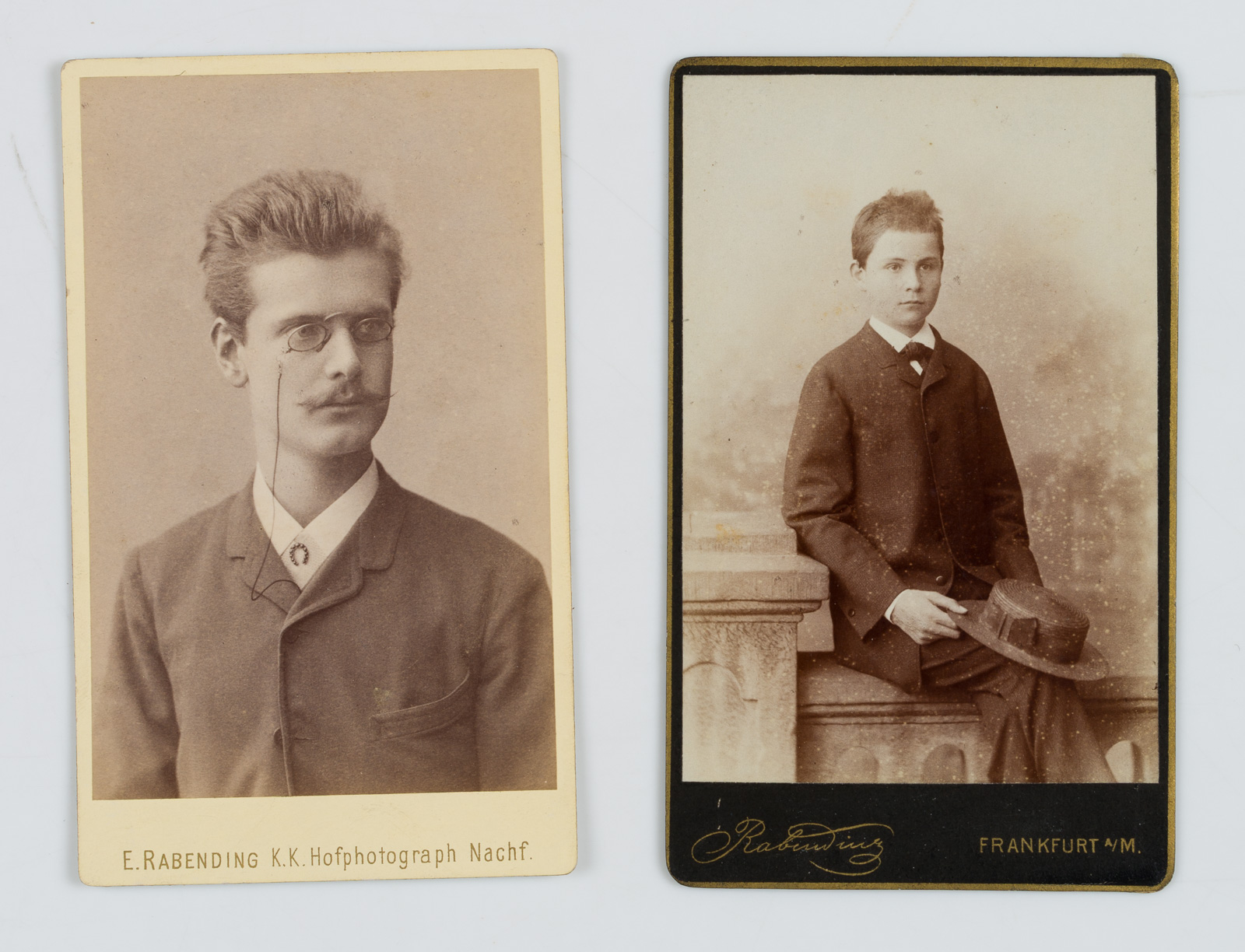 Atelier Rabending (19. Jahrhundert), 2 Cartes de Visite. Portrait eines Jungen im Anzug mit Hut in der Hand. Portrait des Otto Pranger mit Brille und Schnauzer. Freund oder Bekannter des Ferdinand Blum, 19. Jahrhundert, Original-Fotografie