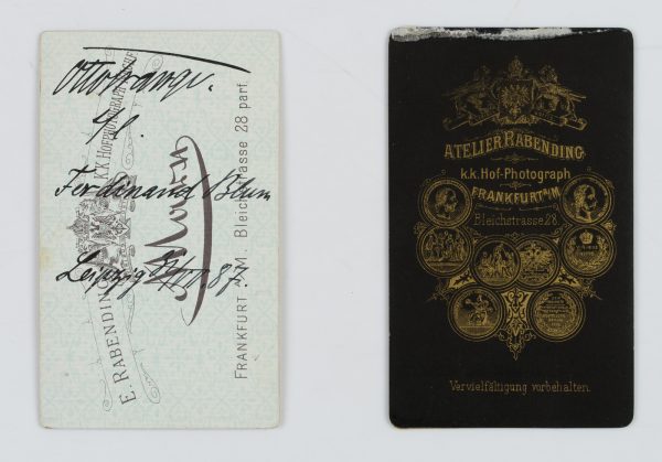 - Description: By the court photographer E. Rabending, Bleichstr. 28, Frankfurt. The portrait of the young man is handwritten on the reverse. It comes from the business card collection of Ferdinand Blum (1865 – 1959), who was director of the Biological Institute in Frankfurt am Main. He researched physiology and endocrinology, especially of the adrenal glands, the pancreas and the thyroid gland. He discovered the blood sugar-increasing effect of adrenalin. In 1939 he fled to Switzerland.